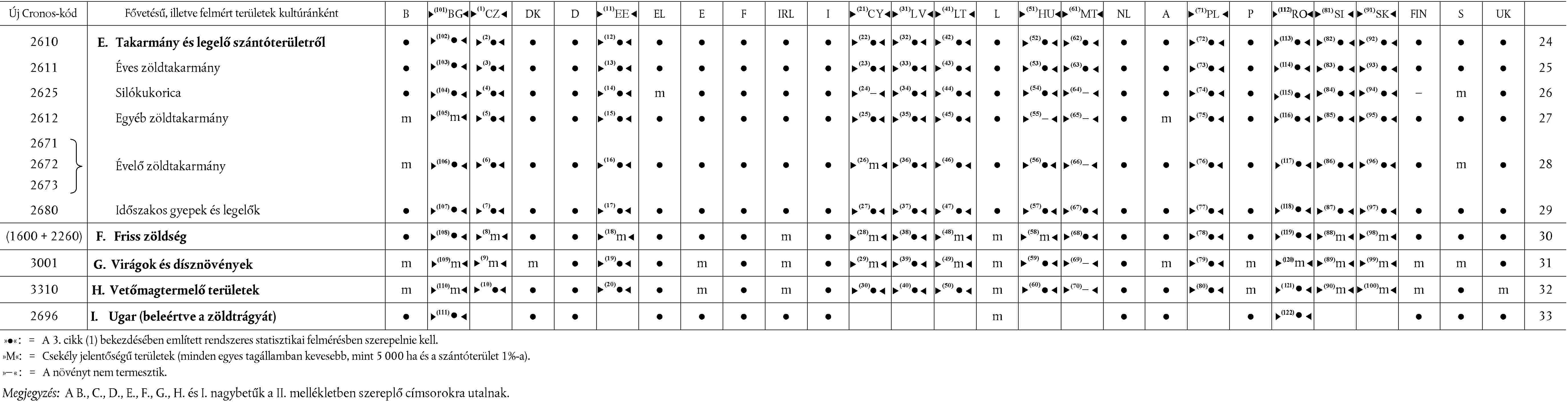 (1) A szántóterületről származó takarmány és legelő tartalmazza a következőket: a) zöldtakarmány szántóterületről (Új Cronos-kód: 2611) b) évelő takarmány (Új Cronos-kód: 2671, 2672, 2673) c) időszakos gyepek és legelők (Új Cronos-kód: 2680) Megjegyzés: A gabonafélékre és a rizsre vonatkozó pontosságot az 1990. március 26-i 837/90/EGK tanácsi rendeletben már rögzítették. A B., C., D., E., F. és I. nagybetűk a II. mellékletben szereplő címsorokra utalnak. |