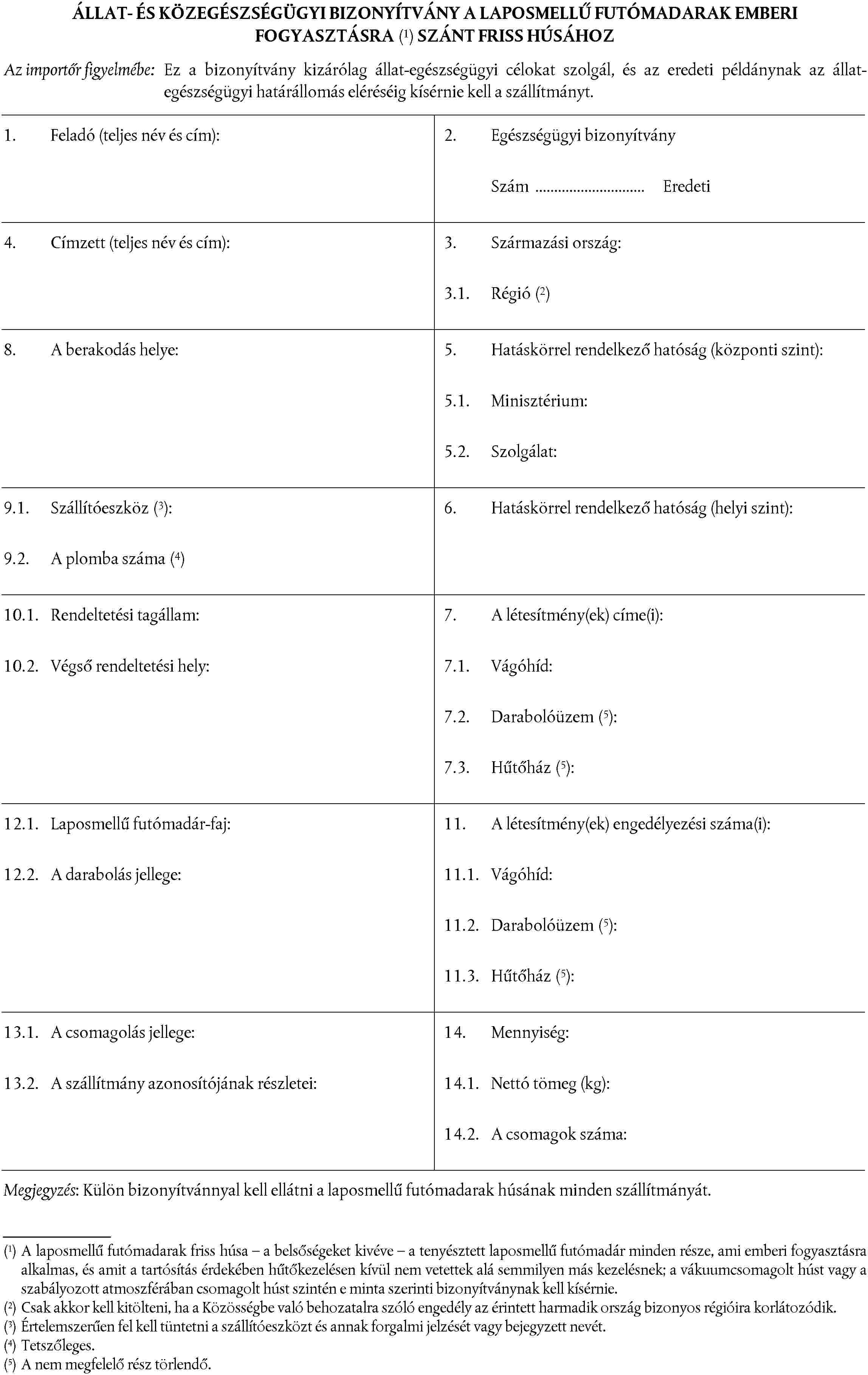 A tagállamok csak az I. mellékletben felsorolt harmadik országokat vagy harmadik országok részeit hatalmazzák fel a tenyésztett laposmellű futómadarak húsának behozatalára, feltéve, hogy az eleget tesz a II. mellékletben megállapított, megfelelő egészségügyi bizonyítvány követelményeinek, valamint ilyen, helyesen kitöltött és aláírt bizonyítvány kíséri. A bizonyítványnak tartalmazza a II. melléklet 1. részével megegyező általános részt, az I. mellékletben meghatározott, szükséges ("A"vagy"B") minta szerint.
