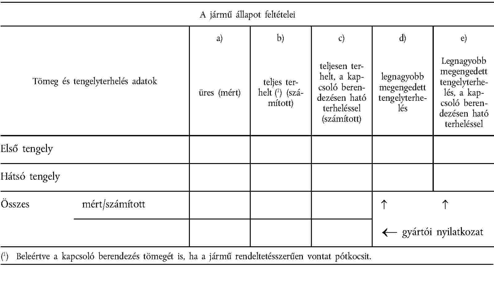 - az üres gépjármű tömeg és tengelyterhelési adatai ([a] oszlop) megfelelnek a gyártó által meghatározottaknak +/- 5 %-os tűréshatáron belül; (ebben az esetben a gyártó által meghatározott tömegadatokat kell felhasználni a b), illetve a c) oszlopban szereplő tömegadatok kiszámításához),