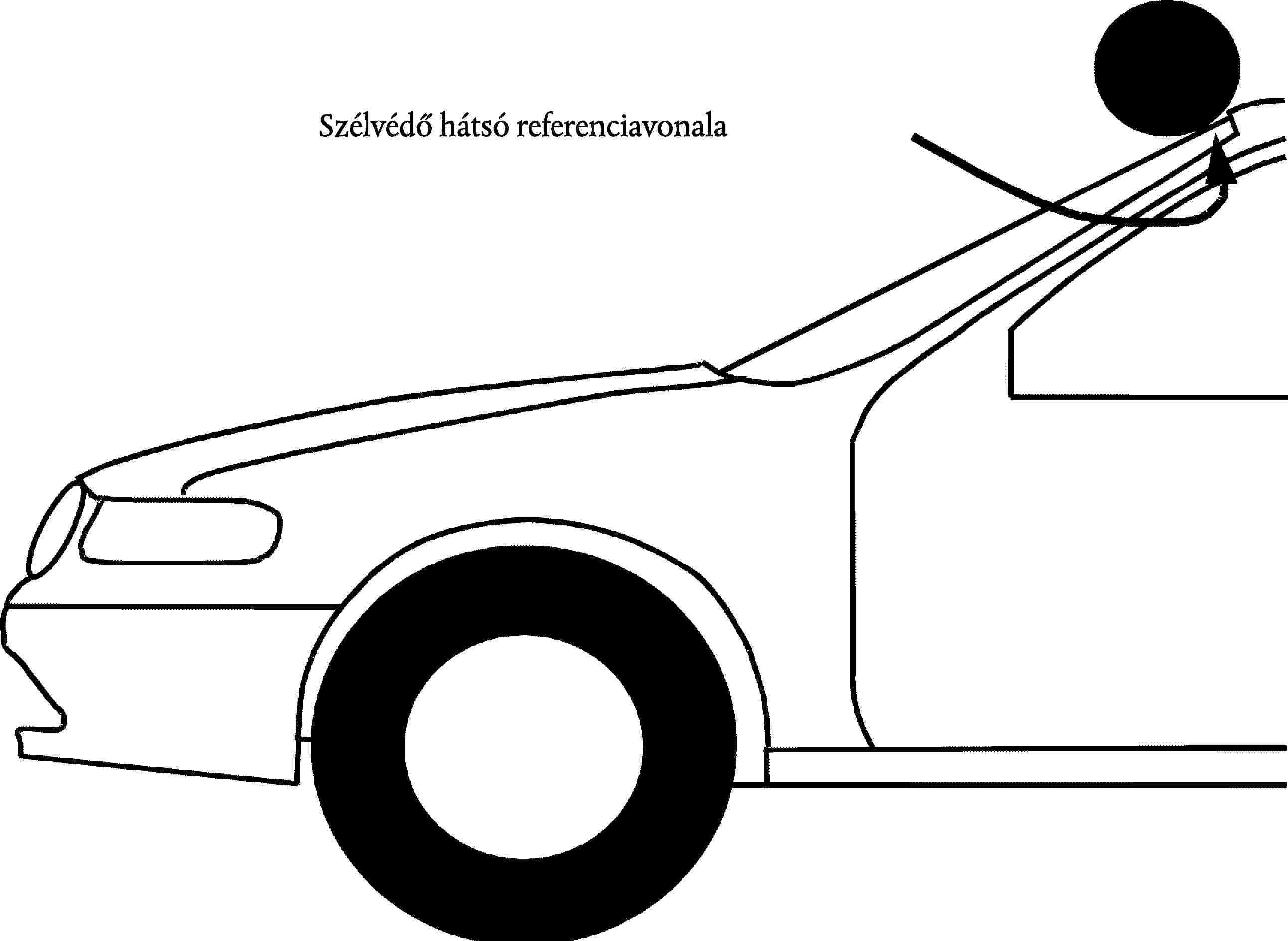 2.9.7. "Motorházfedél hátsó referenciavonala": egy gömb és a 2.7. pontban meghatározott felület közötti leghátsó érintkezési pontok mértani vonala, amikor a gömböt keresztirányban végigvezetik a motorházfedél felső felületén, miközben folyamatosan érintkezik a szélvédővel (lásd a 7. ábrát). Az eljáráshoz az ablaktörlőlapátokat és karokat el kell távolítani. Az irányelv I. mellékletének 3.1. pontjában leírt vizsgálatoknál a gömb átmérője 165 mm. Az irányelv I. mellékletének 3.2. pontjában leírt vizsgálatoknál a gömb átmérője 165 mm, ha a jármű középvonalán az alsó szélvédőkeret 2.8. pontban meghatározott kifejtett hossza a talajtól legalább 1 500 mm vagy ennél nagyobb, és a gömb átmérője 130 mm, ha ez a kifejtett hossz 1 500 mm-nél kisebb. Ha a motorházfedél hátsó referenciavonalának kifejtett hossza a talajtól több mint 2 100 mm, a motorházfedél hátsó referenciavonalát a 2.8. pontban meghatározott 2 100 mm-es kifejtett hossz vonala határozza meg. Ha a motorházfedél hátsó referenciavonala és a motorházfedél oldalsó referenciavonalai nem metszik egymást, a motorházfedél hátsó referenciavonalát a 2.9.9. pontban leírt eljárásnak megfelelően ismételten meg kell határozni.