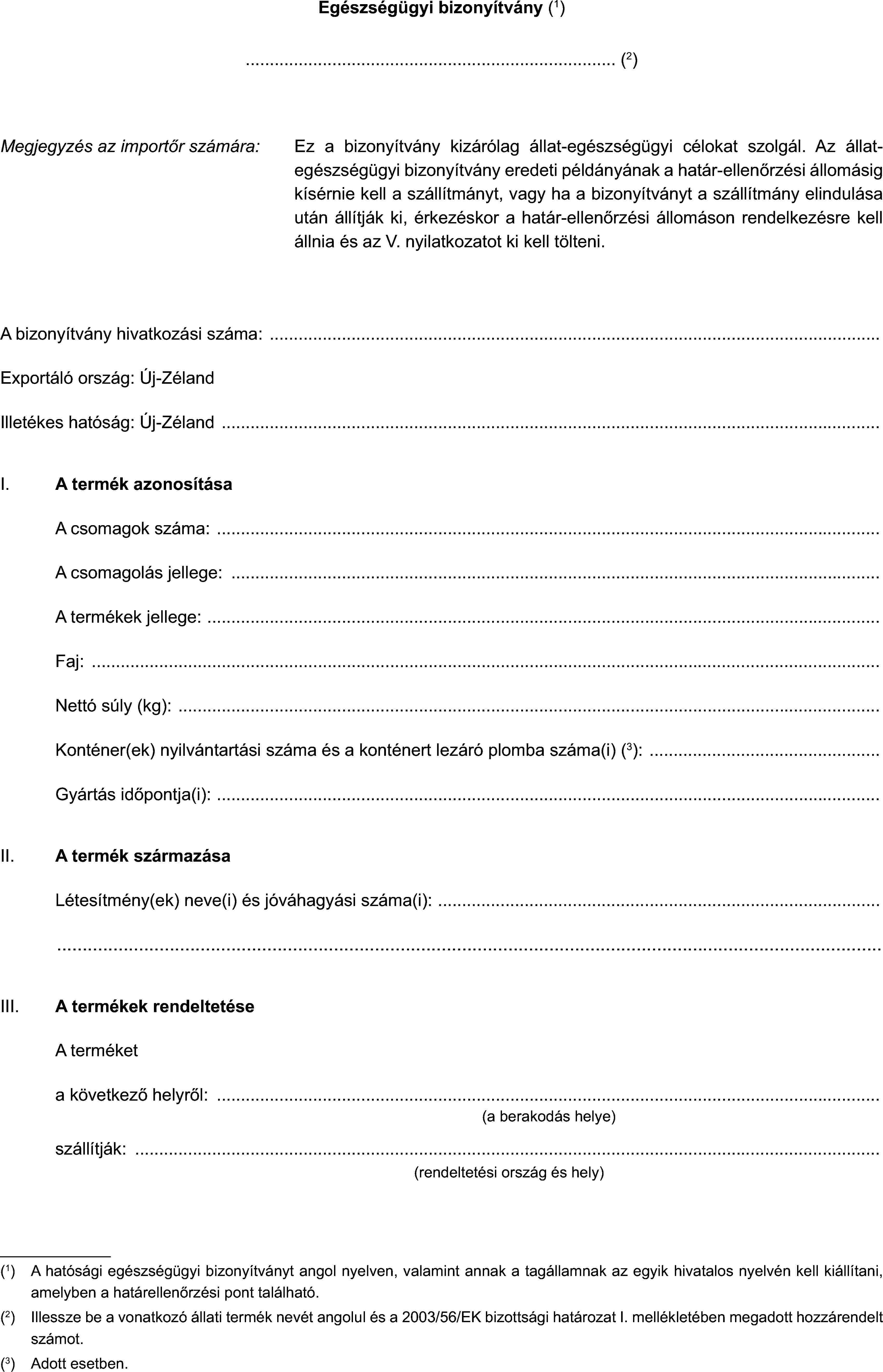 (1) A tagállamok engedélyezik Új-Zélandról az I. mellékletben felsorolt élő állatok és állati termékek behozatalát, feltéve hogy azok megfelelnek a fenti mellékletben említett bizonyítványkiállítási követelményeknek, és amennyiben szükséges, azokat a szállítmány Új-Zélandról való elindítása előtt az alábbi minták valamelyikével összhangban kiállított hivatalos egészségügyi bizonyítvány kíséri: