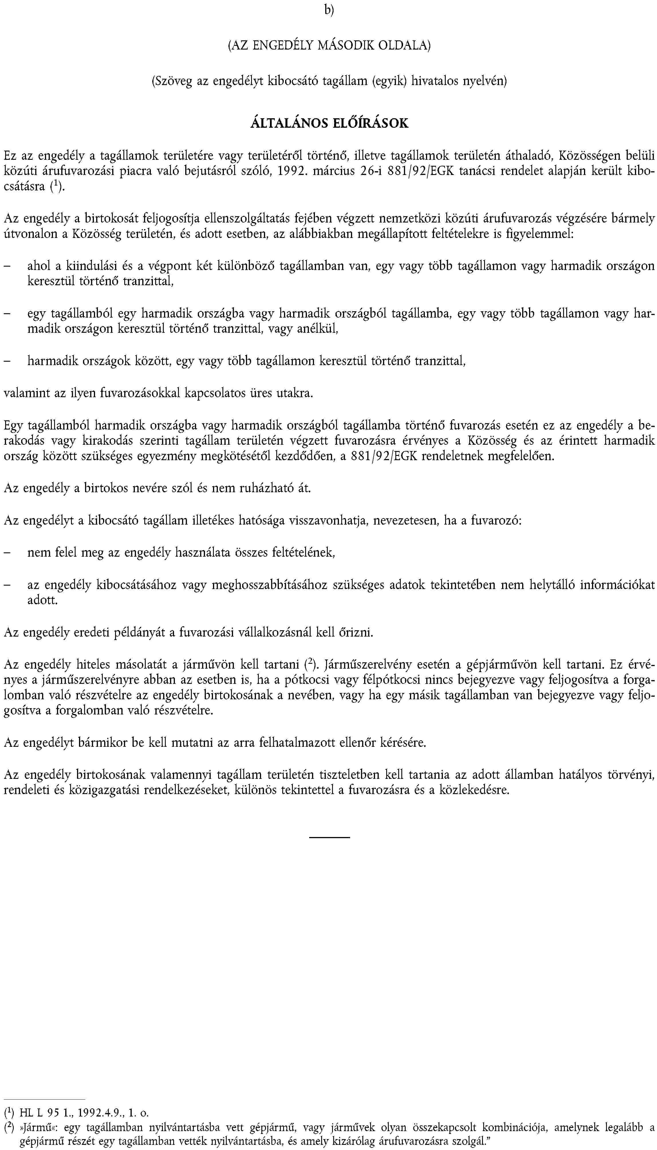 A Tanács 881/92/EGK rendelete (1992. március 26.) a tagállamok területére vagy területéről történő, illetve a tagállamok területén áthaladó, Közösségen belüli közúti árufuvarozási piacra való bejutásról