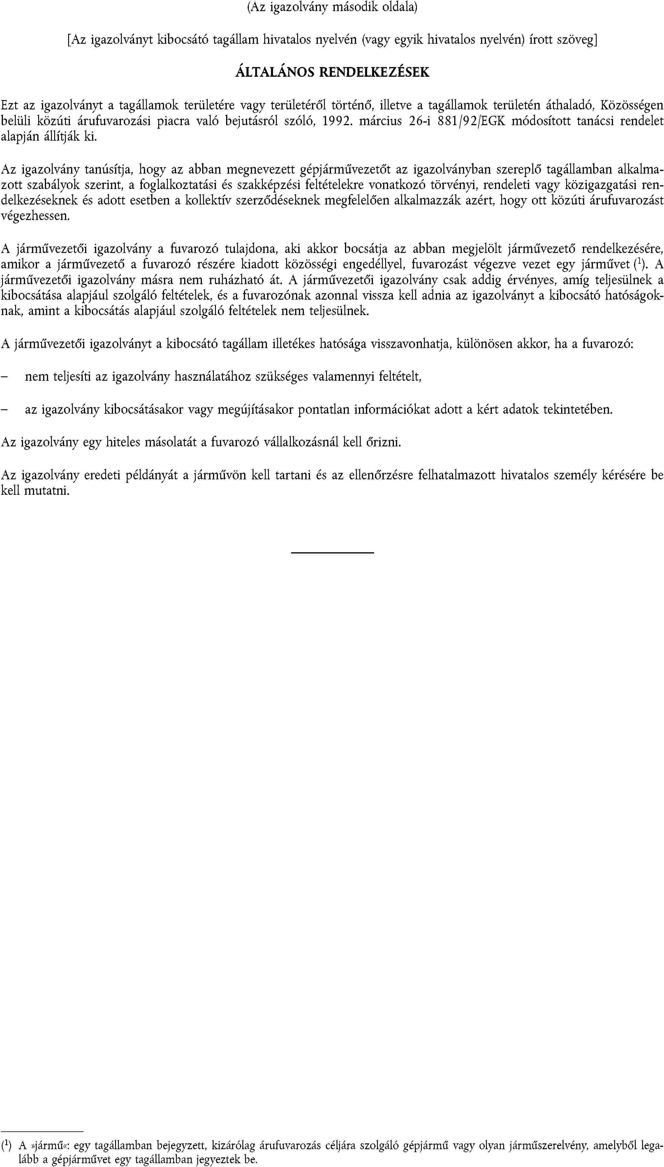(2) A 3. cikkben említett járművezetői igazolvány igazolja, hogy a közösségi engedéllyel végzett közúti fuvarozás keretében a fuvarozást végző, harmadik országbeli állampolgárságú járművezetőt a fuvarozó székhelye szerinti tagállamban az adott tagállamban alkalmazott szabályok szerint, a foglalkoztatási és szakképzési feltételekre vonatkozó törvényi, rendeleti vagy közigazgatási rendelkezéseknek és adott esetben a kollektív szerződésnek megfelelően alkalmazzák azért, hogy ott közúti fuvarozást végezhessen.
