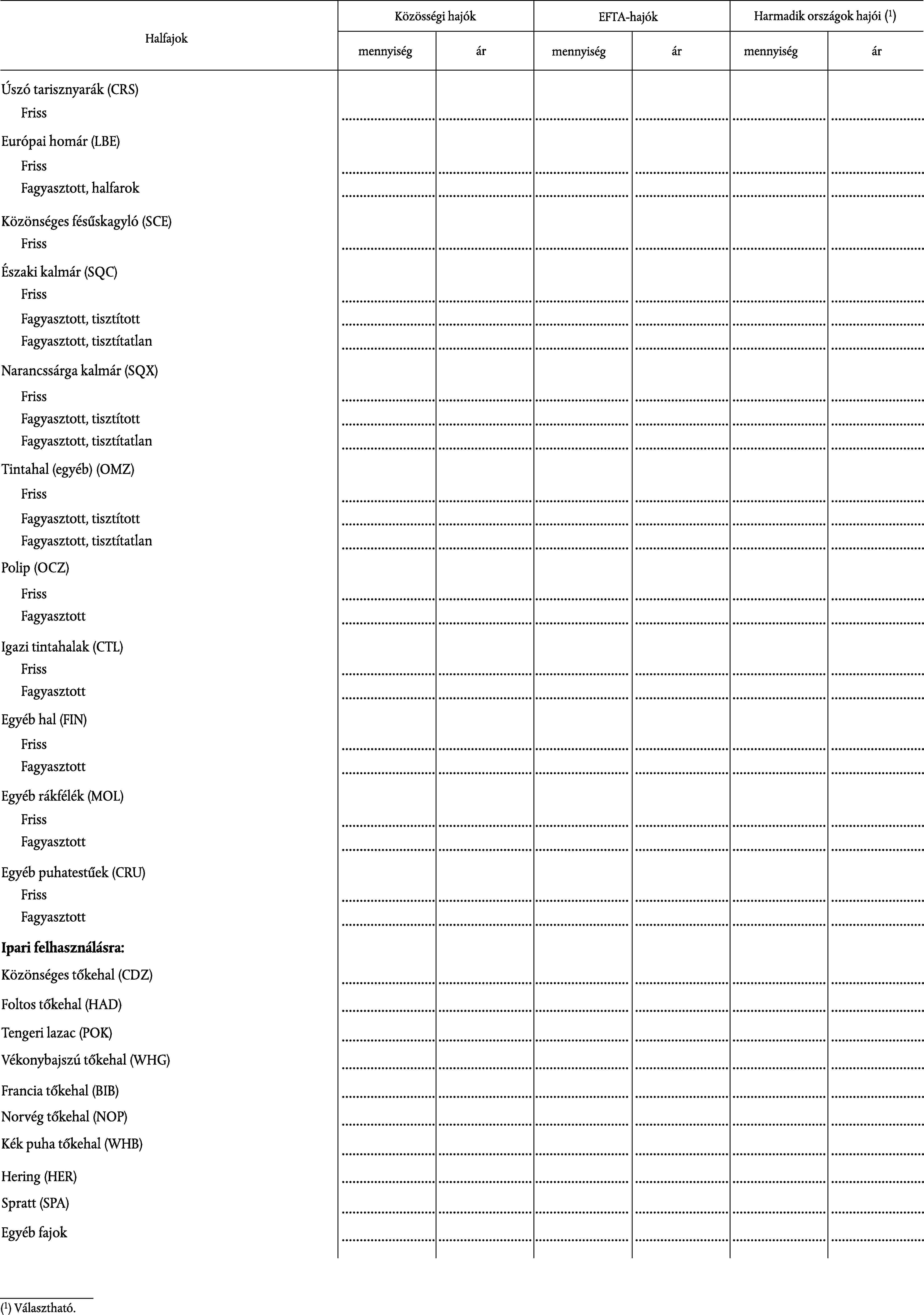 Átlagár: az átlagárat nemzeti pénznemben tonnánként kell megadni. A közvetlenül nem értékesített termékek esetében az átlagárat megfelelő módszerrel becsülni kell.