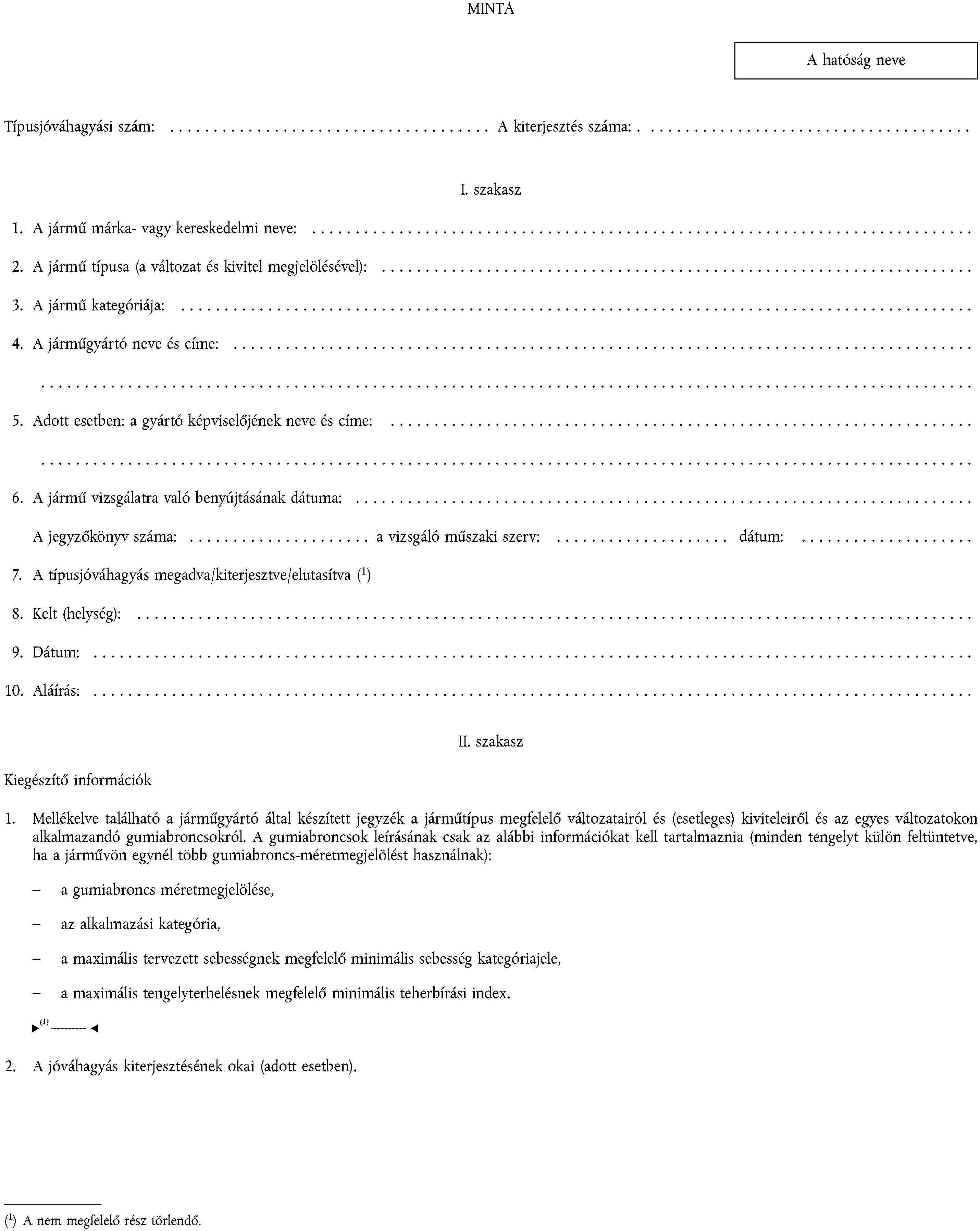 2. függelék | Gumiabroncsoknak motorkerékpárra vagy segédmotoros kerékpárra történő felszerelésére vonatkozó jármű-típusbizonyítvány |