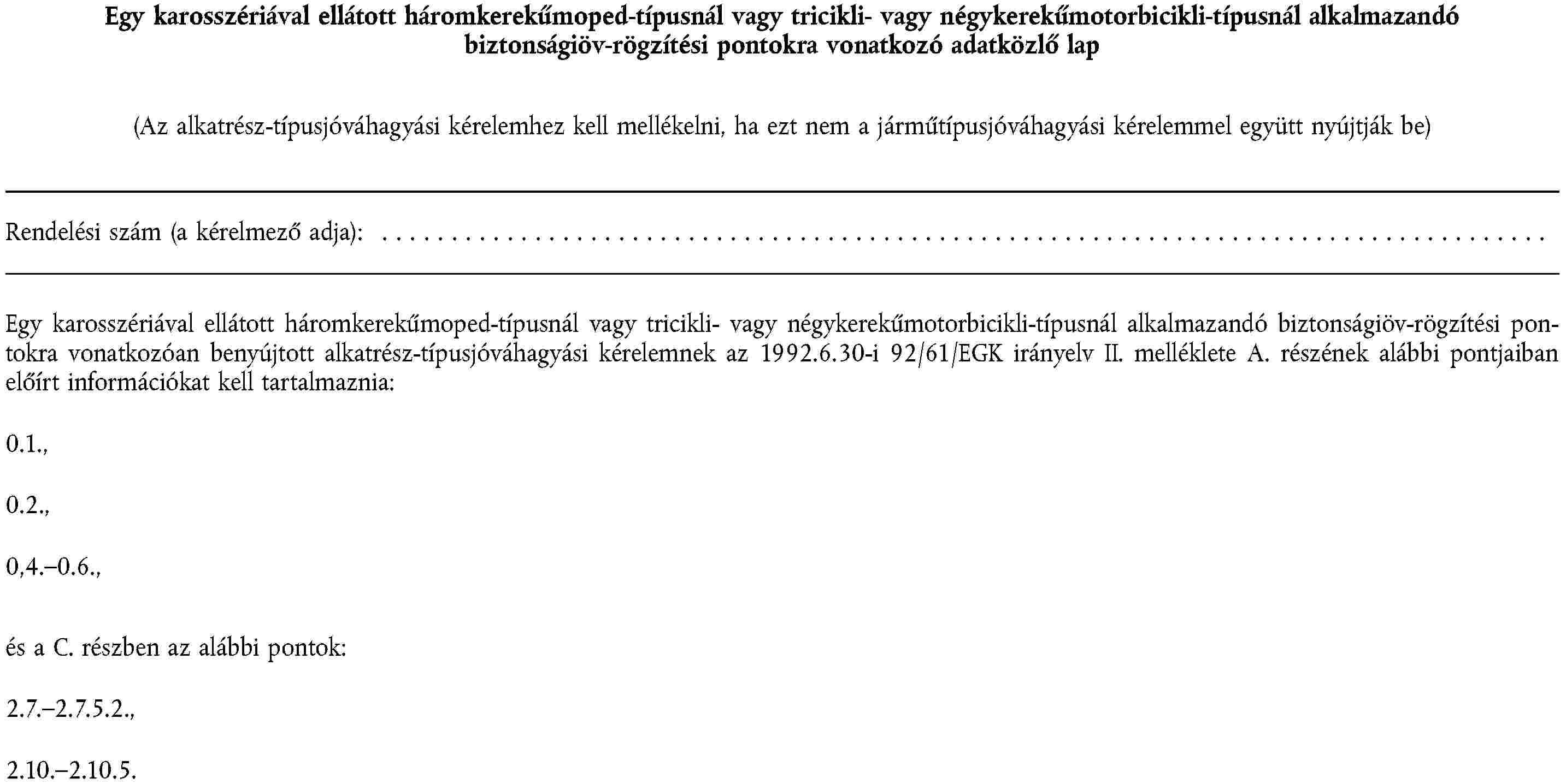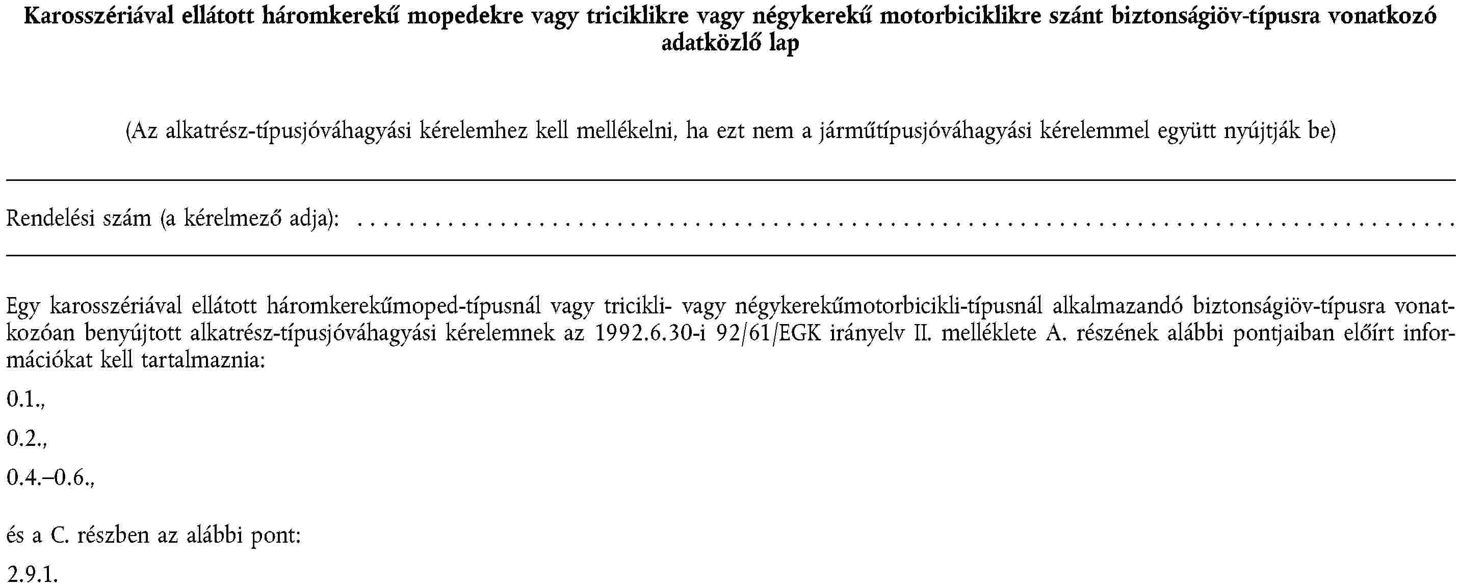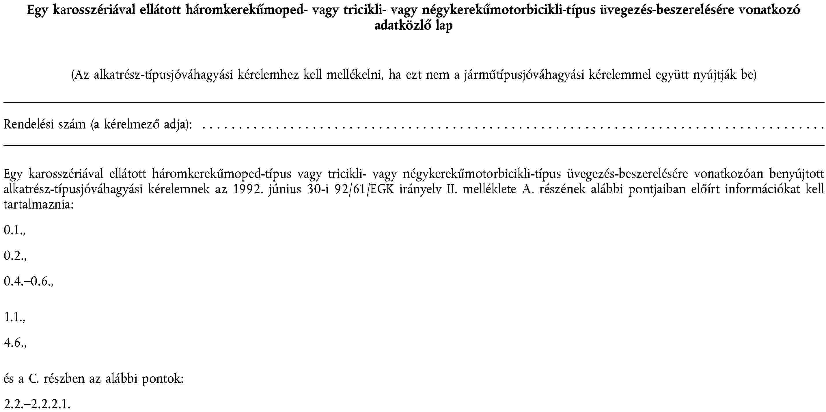 (2) A kinyúló részekre, a légszennyezés elleni intézkedésekre, a beavatkozások elleni intézkedésekre, az elektromágneses összeférhetőségre, a megengedett zajszintre, a pótkocsicsatoló berendezésekre és oldalkocsi-felerősítésekre, a biztonságiöv-rögzítésekre, az ablaktörlő- és mosóberendezésekre, valamint a jég- és páramentesítő berendezésekre mint egy motorkerékpár vagy segédmotoros kerékpár alkatrészére vonatkozó alkatrész-típusjóváhagyás megadásának eljárására, továbbá az ilyen járművek szabad mozgásának feltételeire nézve a 92/61/EGK irányelv II., illetve III. fejezetében foglaltak érvényesek.