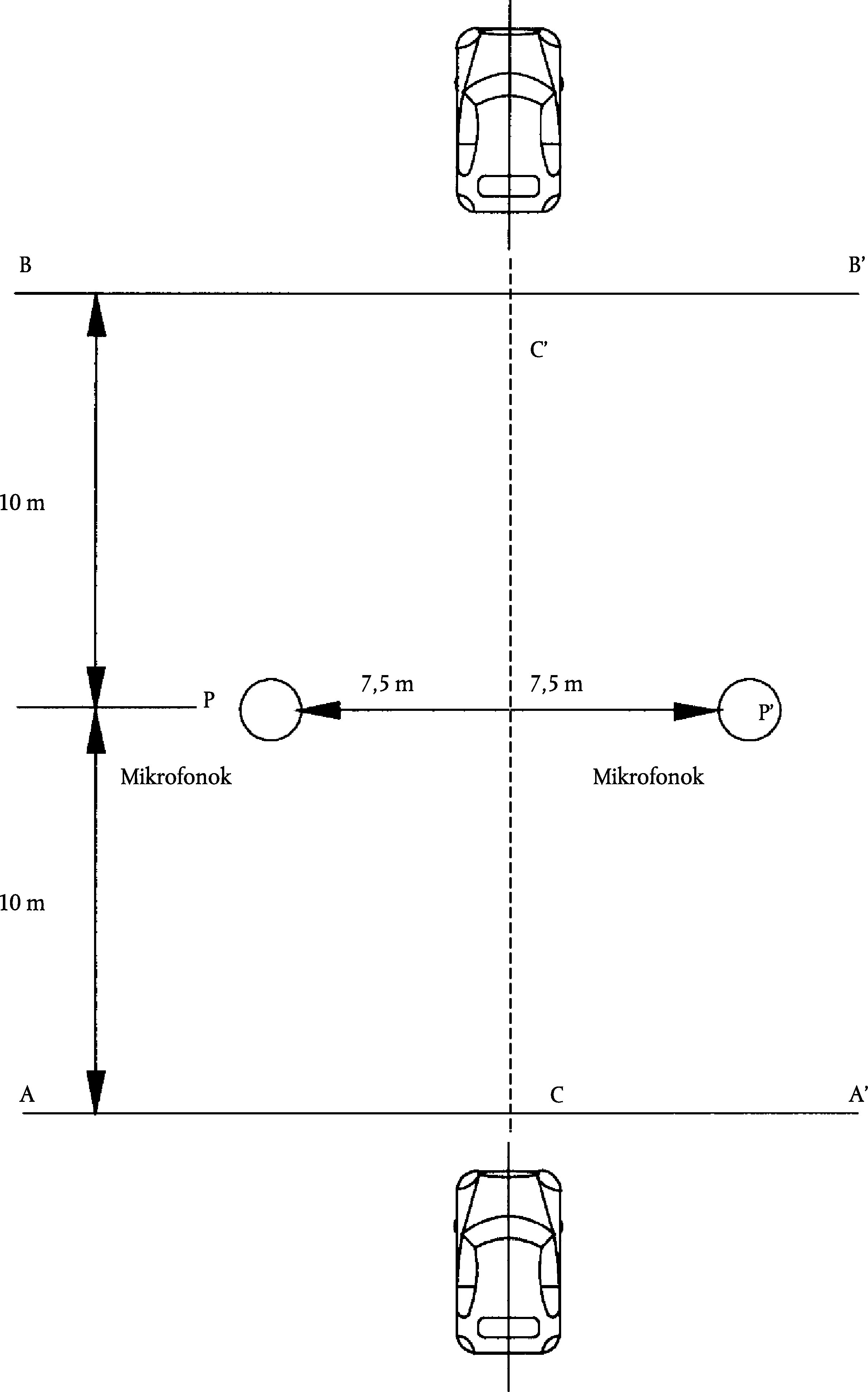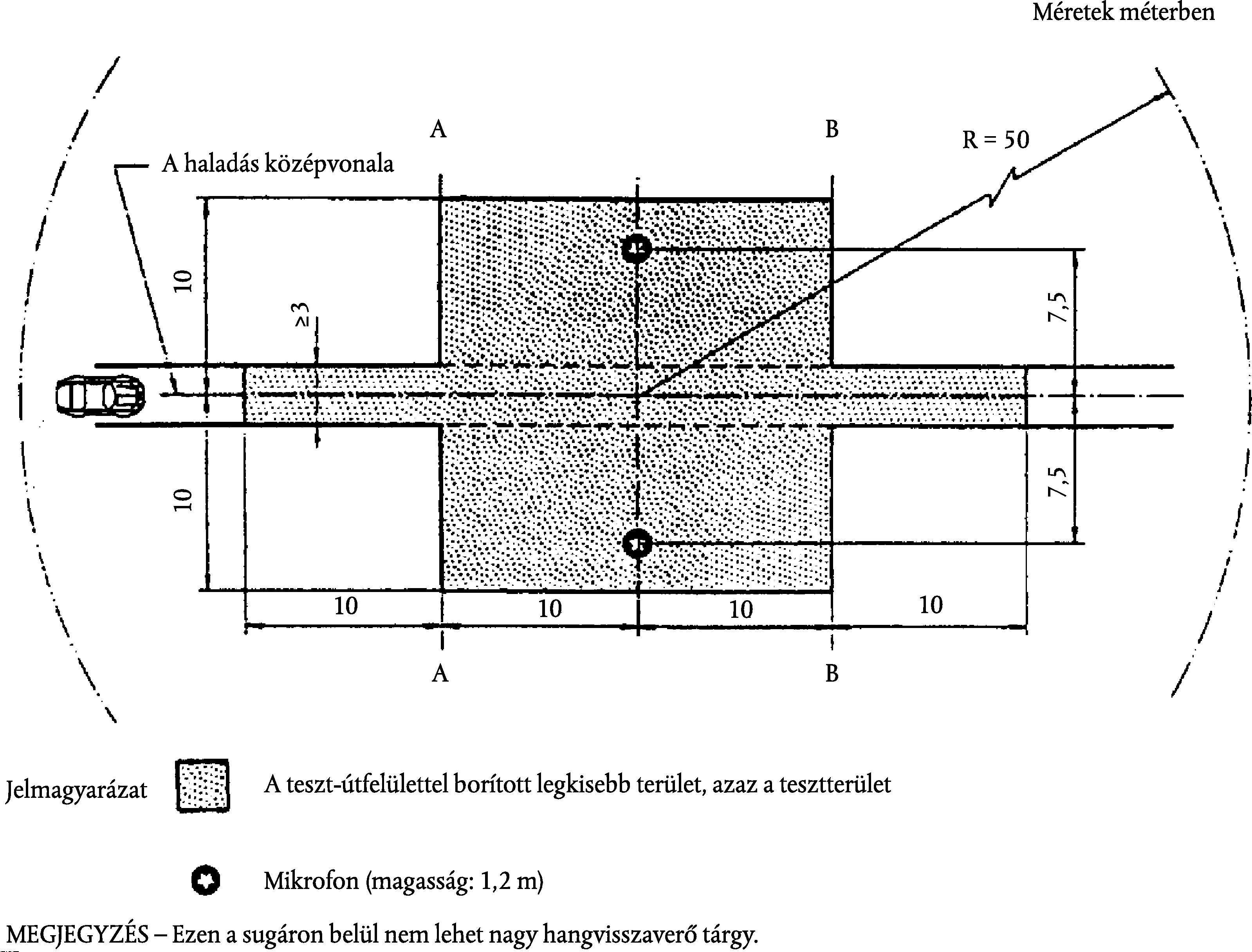 A tesztpálya kialakítása során alapkövetelményként fontos biztosítani, hogy a járművek által bejárt, a tesztsávon áthaladó területet a megfelelő tesztanyag borítsa, megfelelő szegélyrészt hagyva a biztonságos és megfelelő vezetéshez. Ehhez az szükséges, hogy a pálya szélessége legalább 3 méter legyen, és a pálya hossza az AA és BB vonalakon mindkét végén legalább 10 méterrel nyúljon túl. Az 1. ábra egy megfelelő teszthelyszín tervét mutatja be, feltüntetve a géppel lerakott és géppel tömörített legkisebb területet, amelyet a meghatározott tesztanyag borít. Az 5. melléklet 1. függeléke 3.2. szakaszának megfelelően a méréseket a jármű mindkét oldalán el kell végezni. Ez megoldható két mikrofon elhelyezésével (a pálya mindkét oldalán egy) és egy irányba haladva, vagy egy mikrofonnal mérve a pálya egyik oldalán, de a járművel két irányba haladva. Ha ez utóbbi módszert alkalmazzák, arra az oldalra nem vonatkoznak a felületre vonatkozó követelmények, ahol nincs mikrofon.