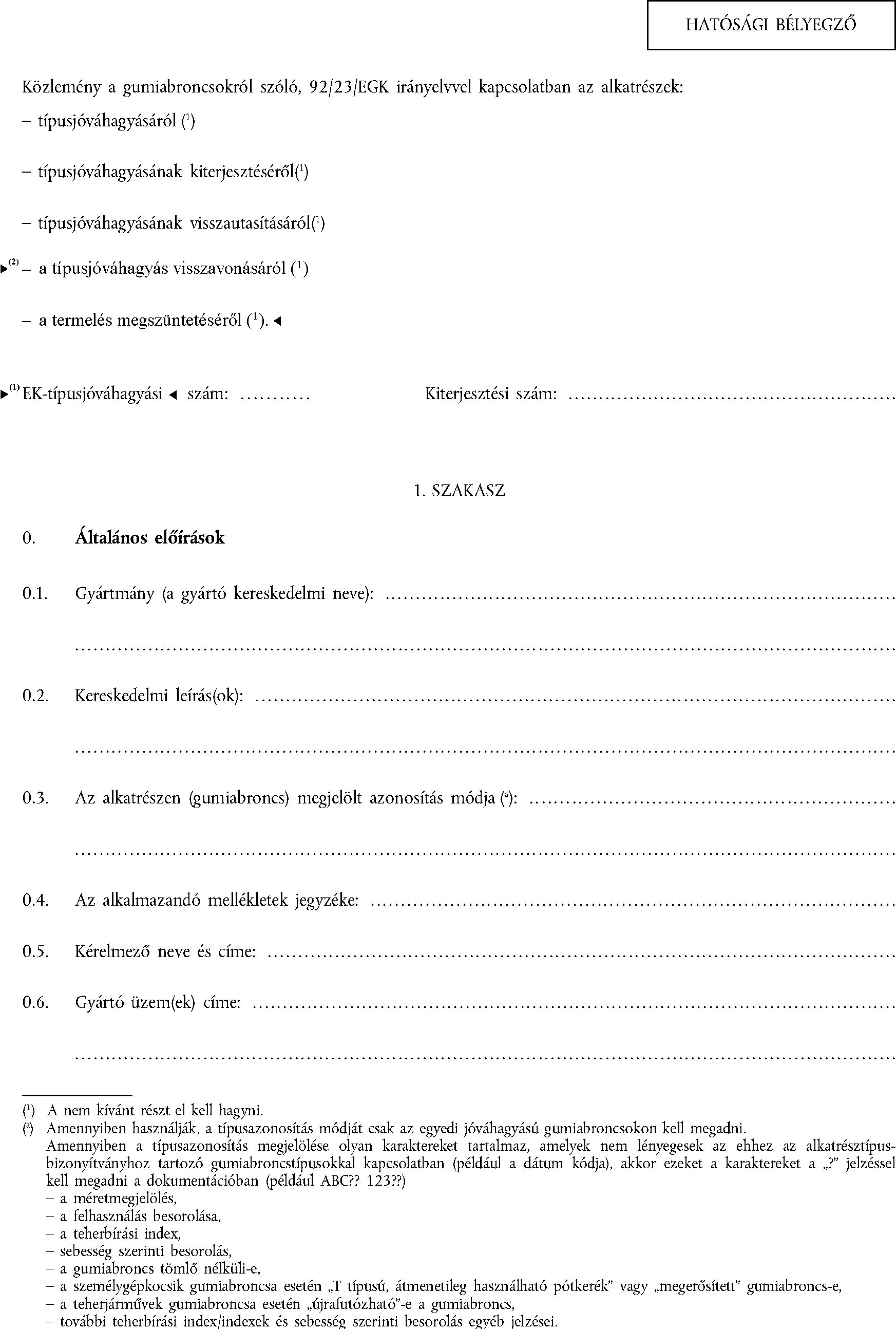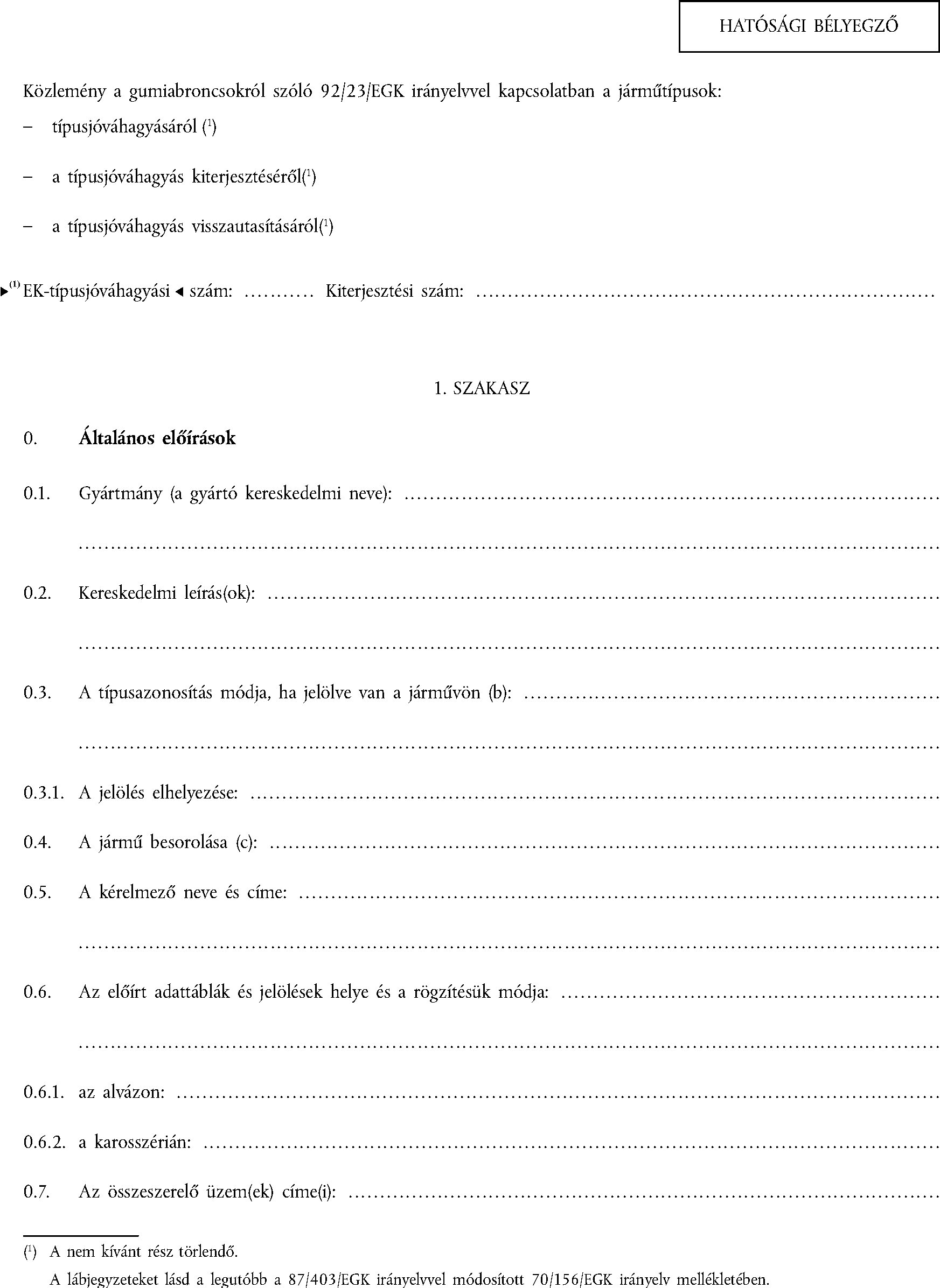 1. ADOTT GUMIABRONCSTÍPUSRA VONATKOZÓ EK-TÍPUSJÓVÁHAGYÁSI KÉRELEM