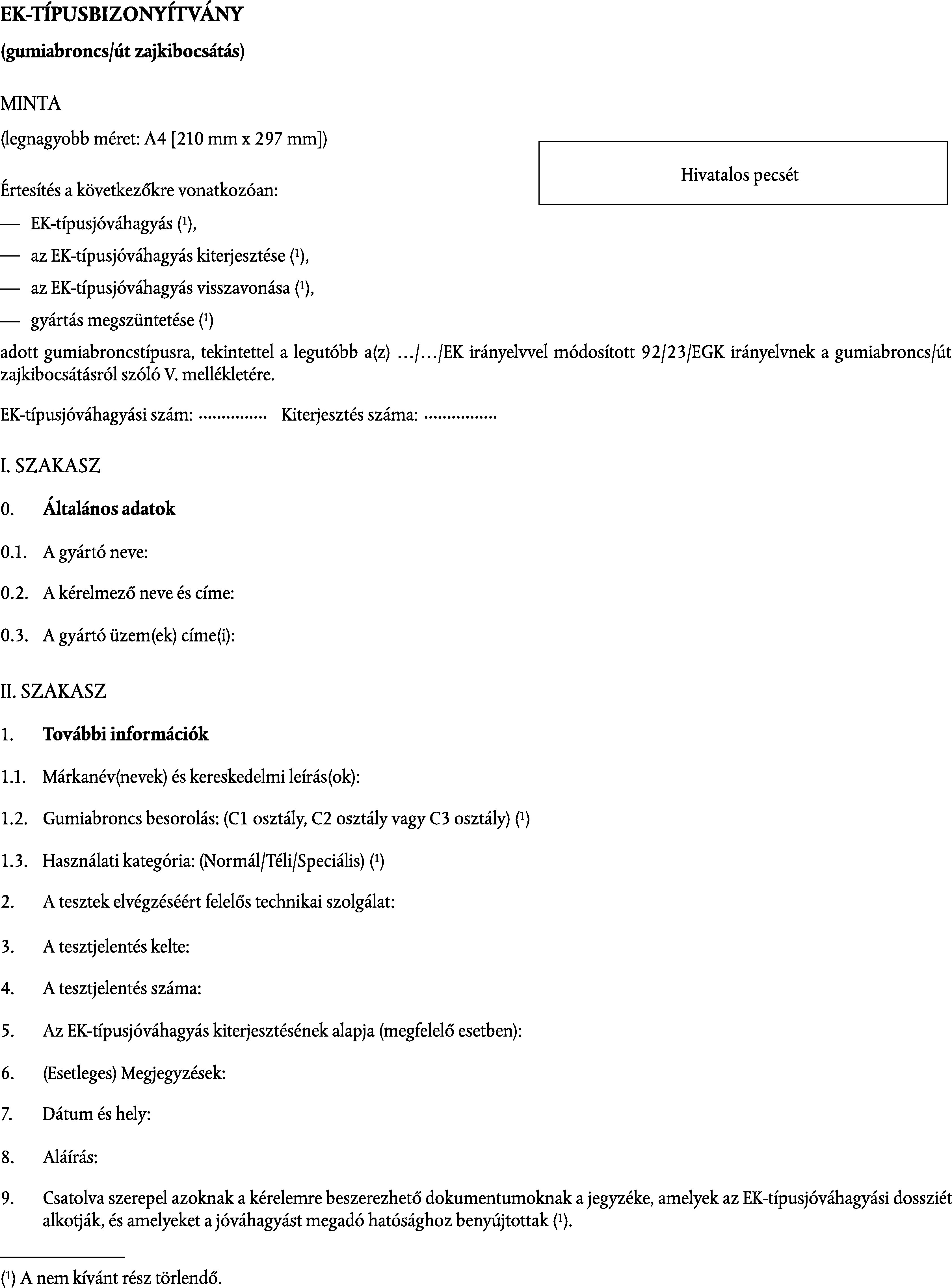 4. függelék | EK-típusbizonyítvány (gumiabroncs/út zajkibocsátás) |