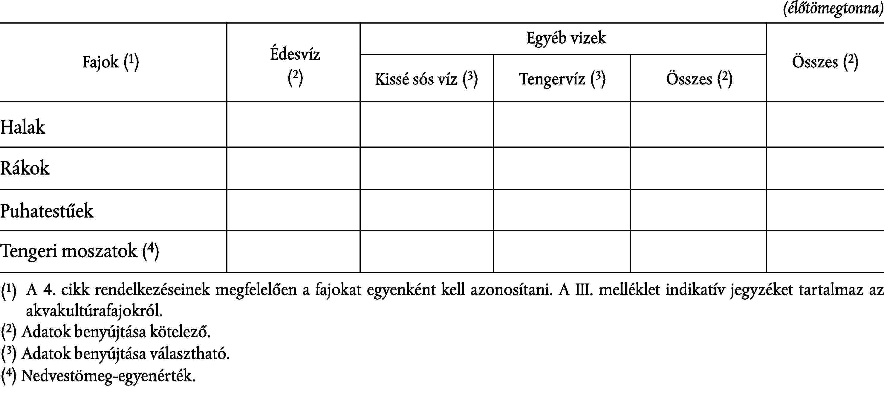 - "akvakultúra-termelés": a végső fogyasztásra kerülő mennyiség, beleértve az extenzív vagy intenzív tenyésztési módszereket, valamint az ipari célokra szolgáló vízi növényeket is. A halkeltetők kibocsátásai (termékei), amelyek az akvakultúra-termelés folyamatába kapcsolódnak be ebbe nem tartoznak bele. A termelést az állatok esetén élőtömegtonnában, míg a vízinövények esetében nedves tömegben kell nyilvántartani.
