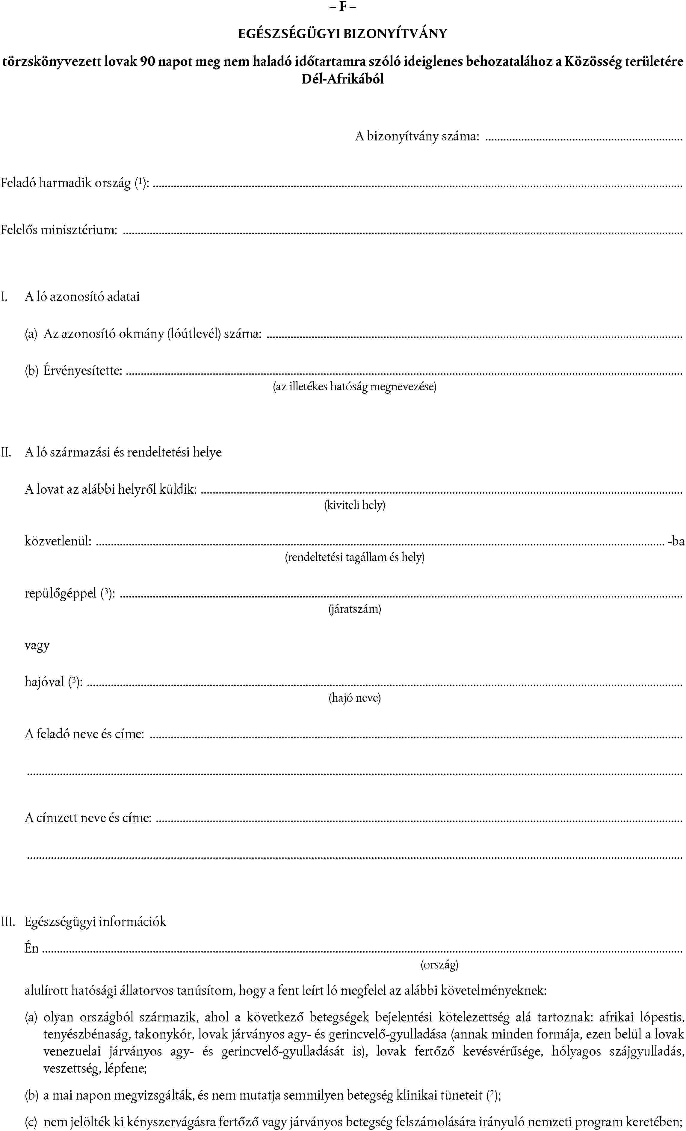 A 92/260/EGK határozat II. mellékletében az "F" állatorvosi bizonyítvány helyébe e határozat I. mellékletének szövege lép.