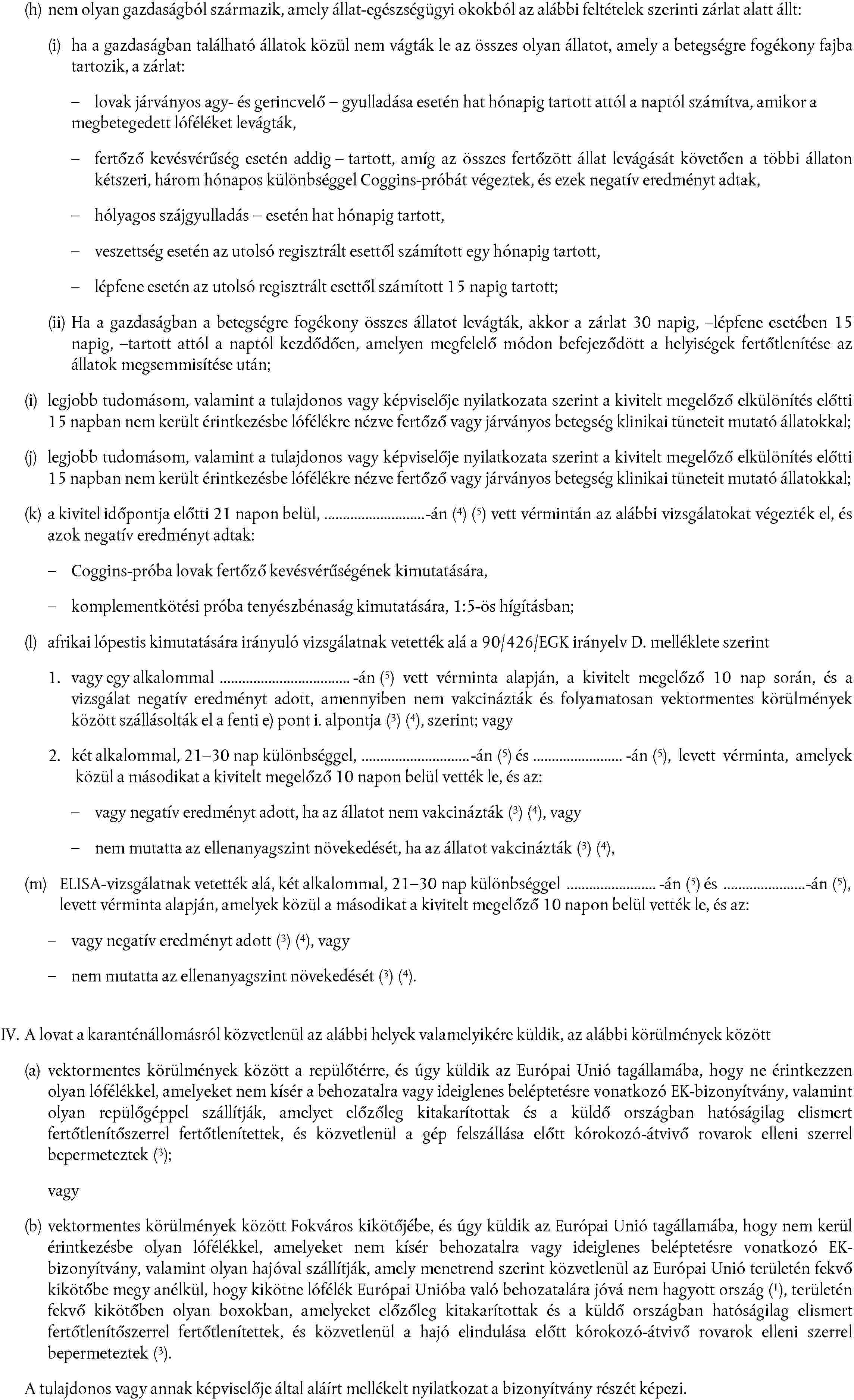 (4) E kiegészítő garanciák megtiltják az afrikai lópestis elleni vakcinázást az afrikai lópestistől mentes területen. Ebből következően azon törzskönyvezett lovak vakcinázási státuszát, amelyek több mint 24 hónapot tartózkodtak az afrikai lópestistől mentes területen, többé nem lehet a jelenlegi behozatali feltételek alapján igazolni.