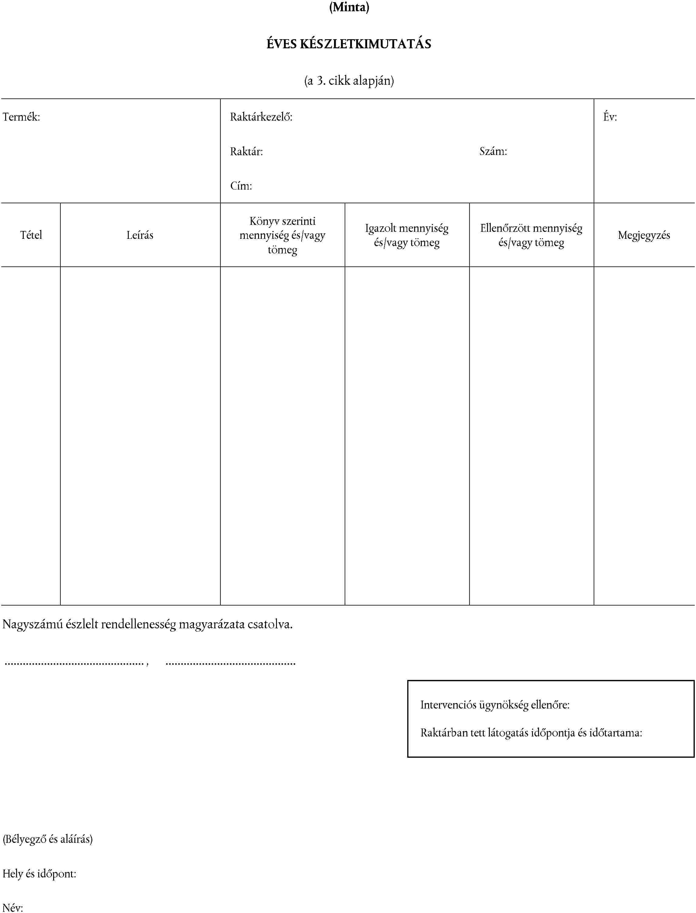 (2) Az éves készletkimutatás, amelynek űrlapmintáját iránymutatásként a II. melléklet tartalmazza, termékre és raktározási helyre lebontva összefoglalja a raktáron lévő mennyiségeket, továbbá minden egyes termékre megadja a raktáron lévő mennyiségeket, a tételek számát (a gabonafélék kivételével), a betárolás évét (a szesz kivételével) és magyarázatot minden észlelt rendellenességre.
