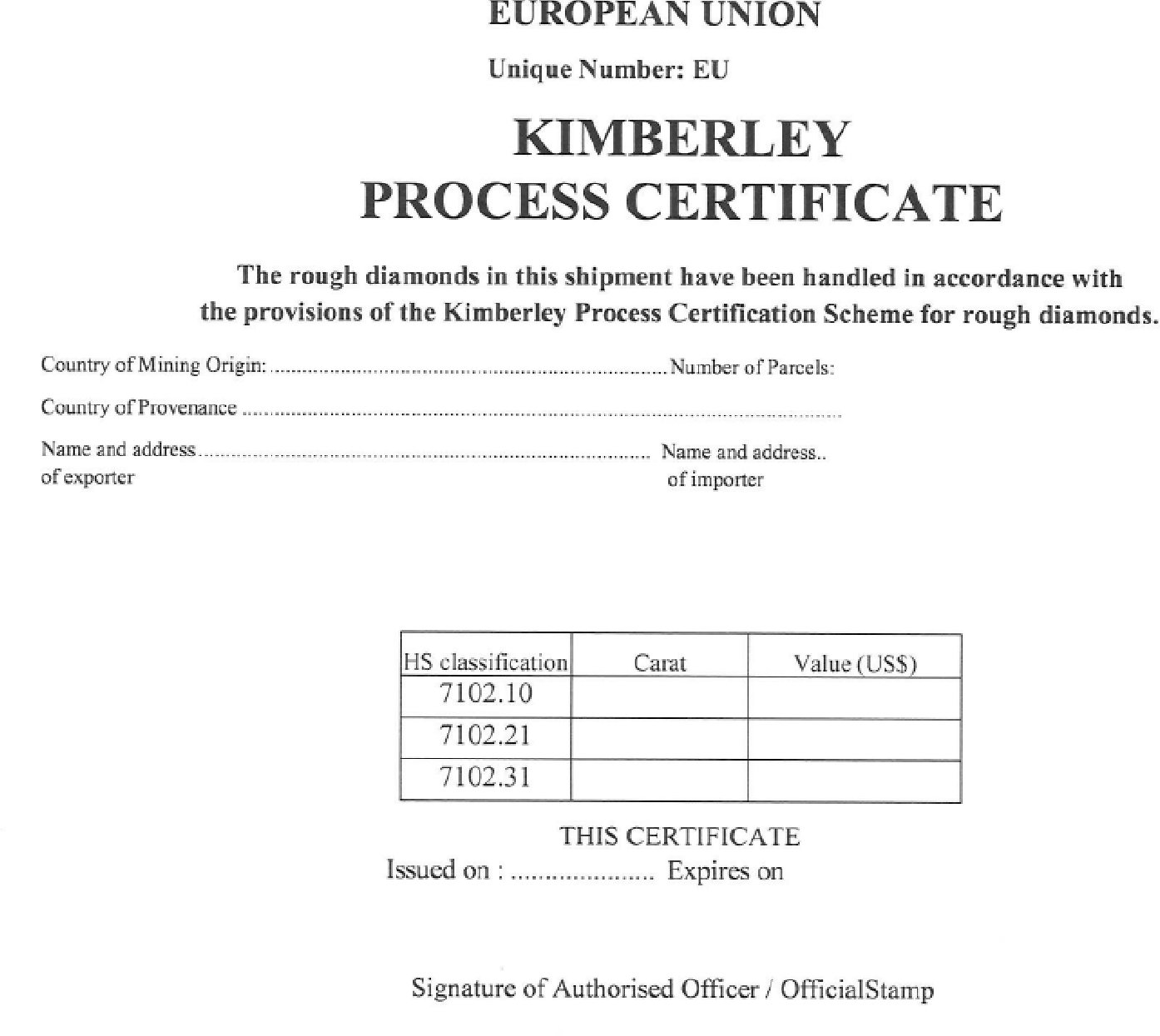 - Extra keskeny nyomtatási sor: "kimberley-i folyamat szerinti tanúsítvány";