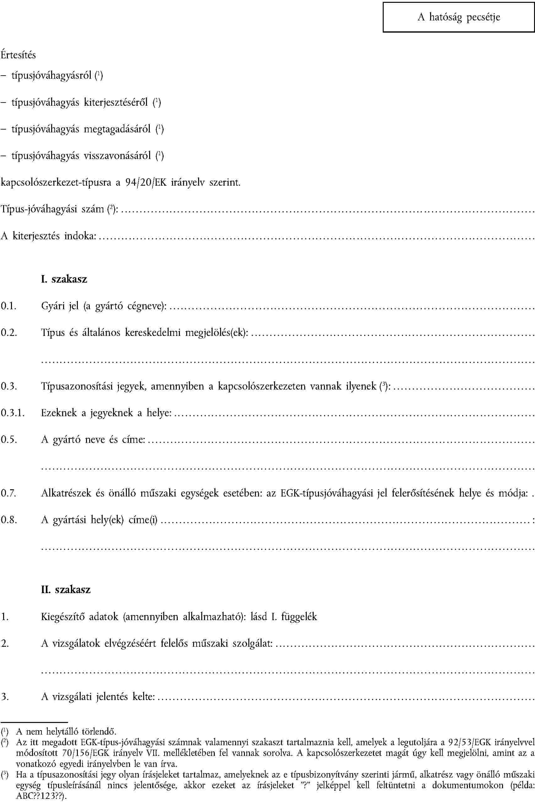 III. MELLÉKLET | A mechanikus kapcsolószerkezetek EGK-típusjóváhagyására vonatkozó adatközlő lap |