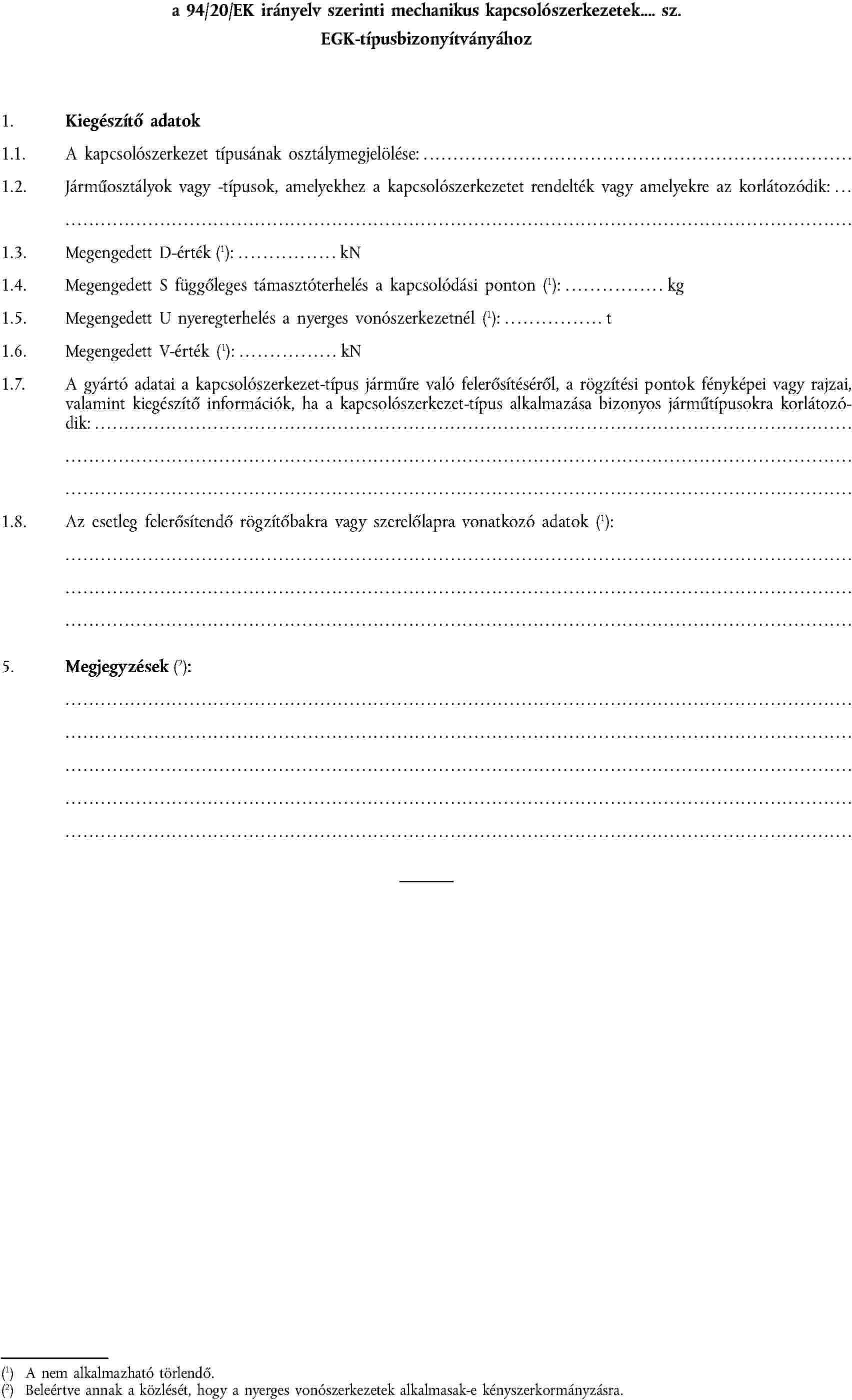1.1. A járműgyártó megállapítja, hogy a kapcsolószerkezetek mely típusát és osztályát lehet felszerelni az adott járműtípusra, és megadja azokat a D, V ( 7 ), S vagy U értékeket (ha alkalmazható), amelyek a járműtípus konstrukcióján - a kapcsolószerkezetek tervezett típusával kombinálva - alapulnak. Az ezen irányelv szerint jóváhagyott kapcsolószerkezetek D, V, S vagy U jellemző értékeinek egyenlőnek vagy nagyobbnak kell lenniük azoknál, amelyek az illető járműtípusra meg vannak adva.