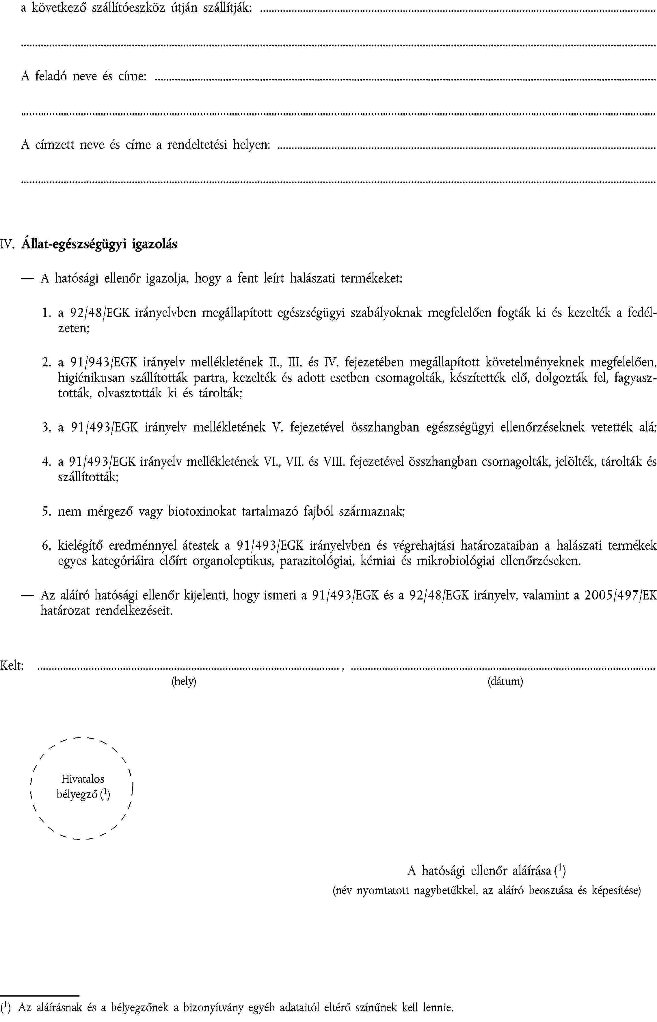 (4) Részletes szabályokat kell megállapítani a Bulgáriából a Közösségbe behozott halászati termékek szállítmányait a 91/493/EGK irányelv értelmében kísérő egészségügyi bizonyítványra vonatkozóan. E szabályoknak ki kell terjedniük különösen egy bizonyítványminta meghatározására, a kiállítás nyelvére (nyelveire) vonatkozó minimumkövetelményekre, valamint a bizonyítvány aláírására jogosult személy beosztására.