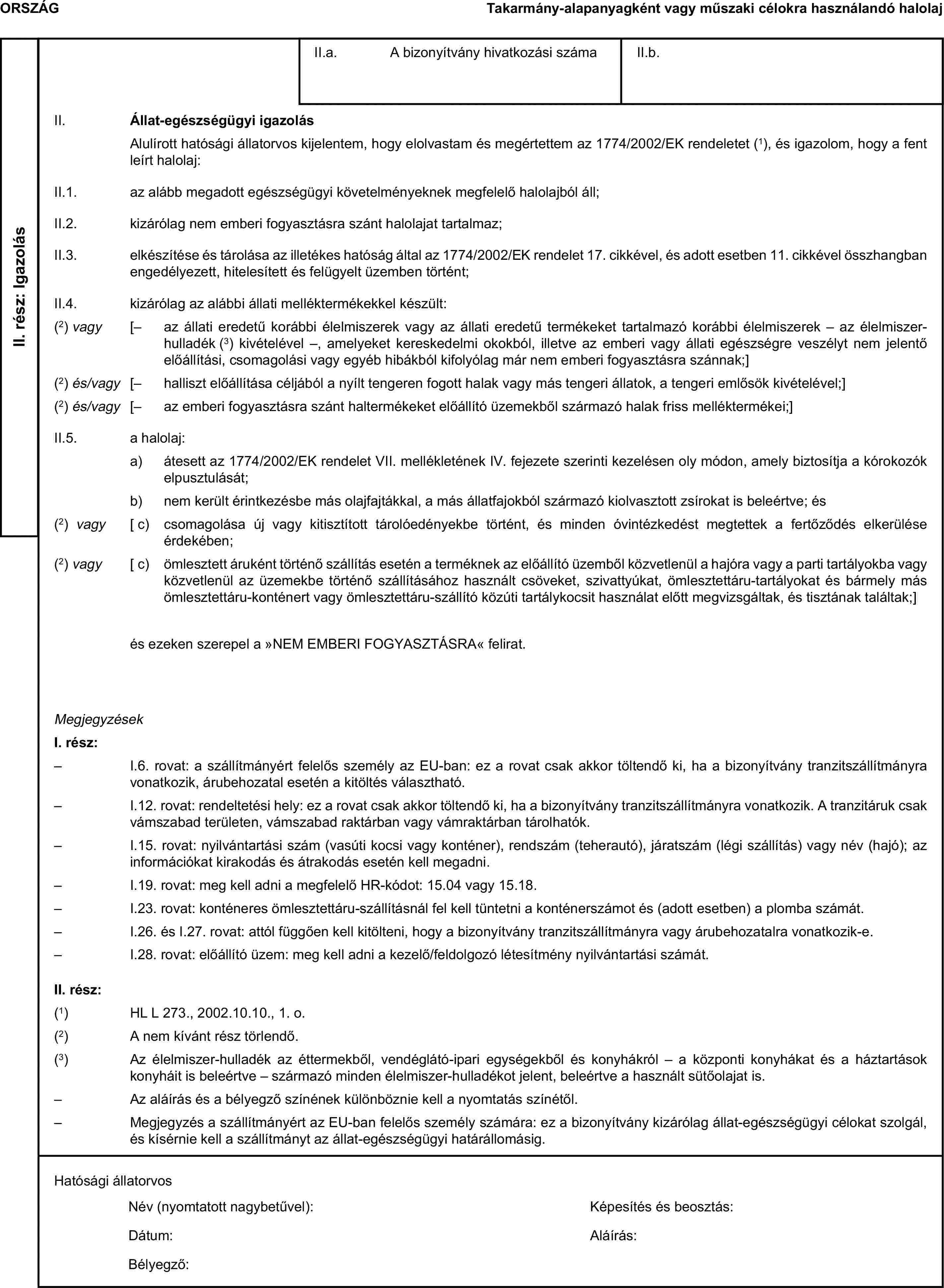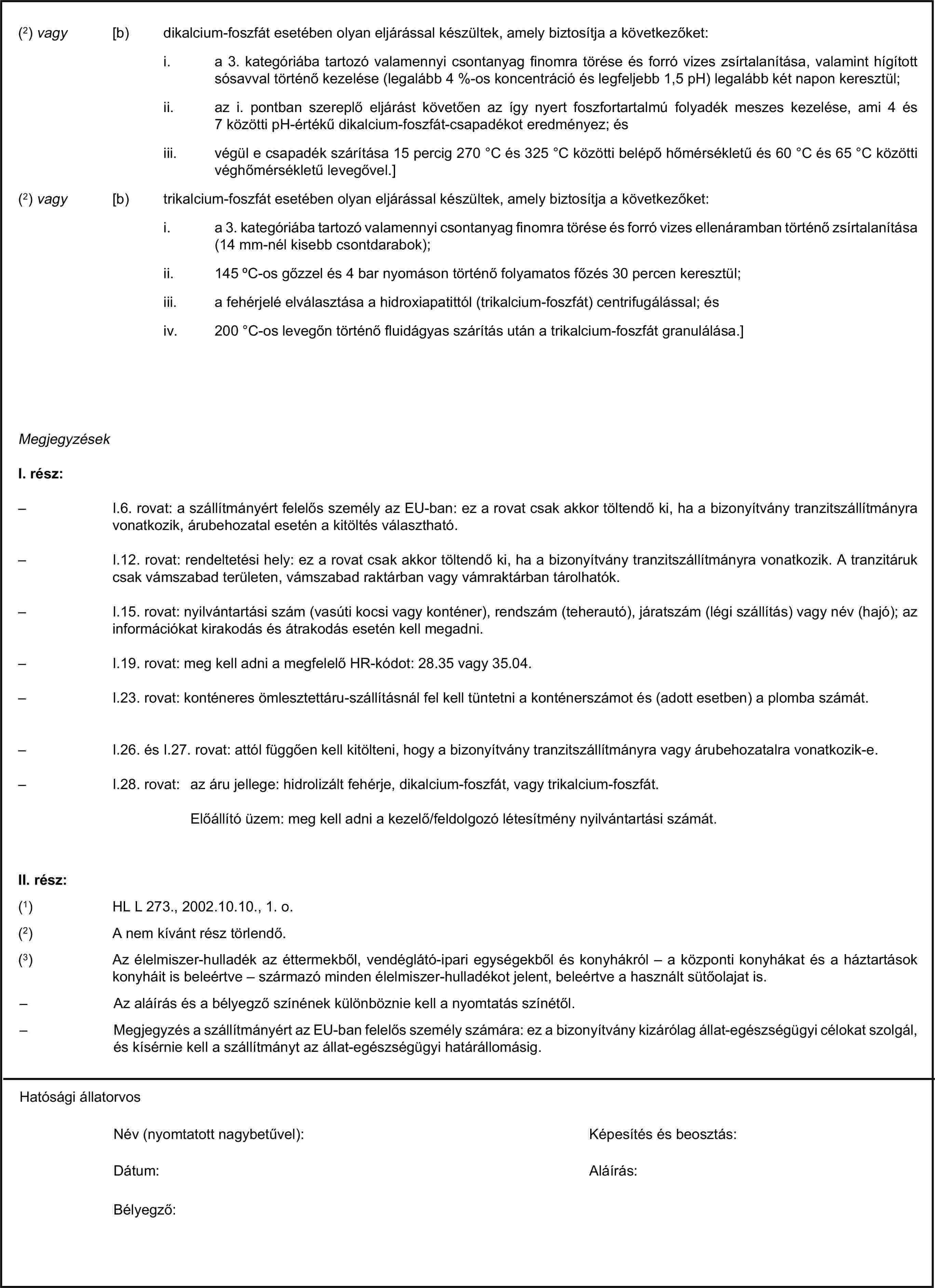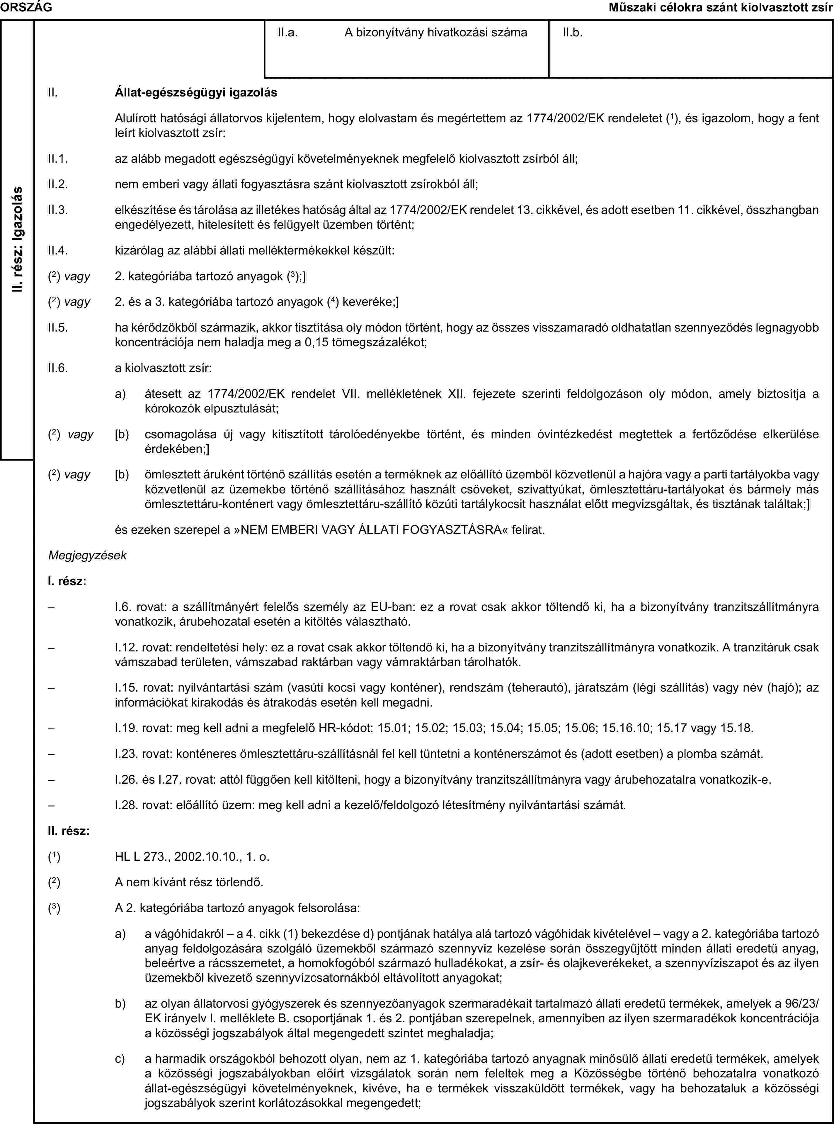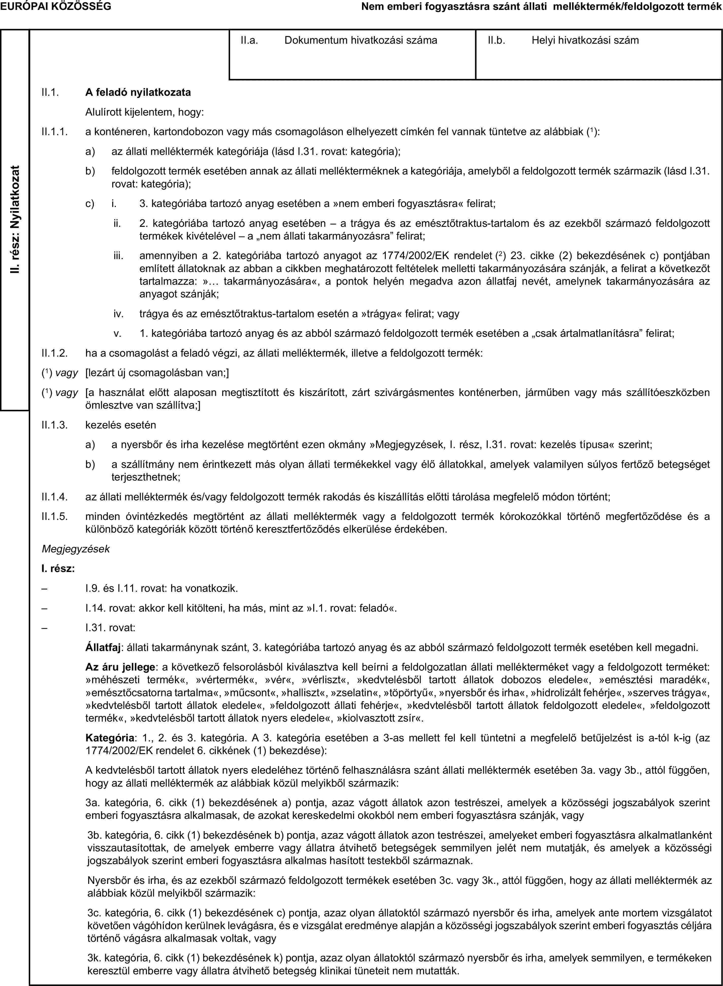 [1] A dokumentum eredetije megtekinthető CELEX: 32002R1774 - https://eur-lex.europa.eu/legal-content/HU/ALL/?uri=CELEX:32002R1774&locale=hu Utolsó elérhető, magyar nyelvű konszolidált változat CELEX: 02002R1774-20100928 - https://eur-lex.europa.eu/legal-content/HU/ALL/?uri=CELEX:02002R1774-20100928&locale=hu