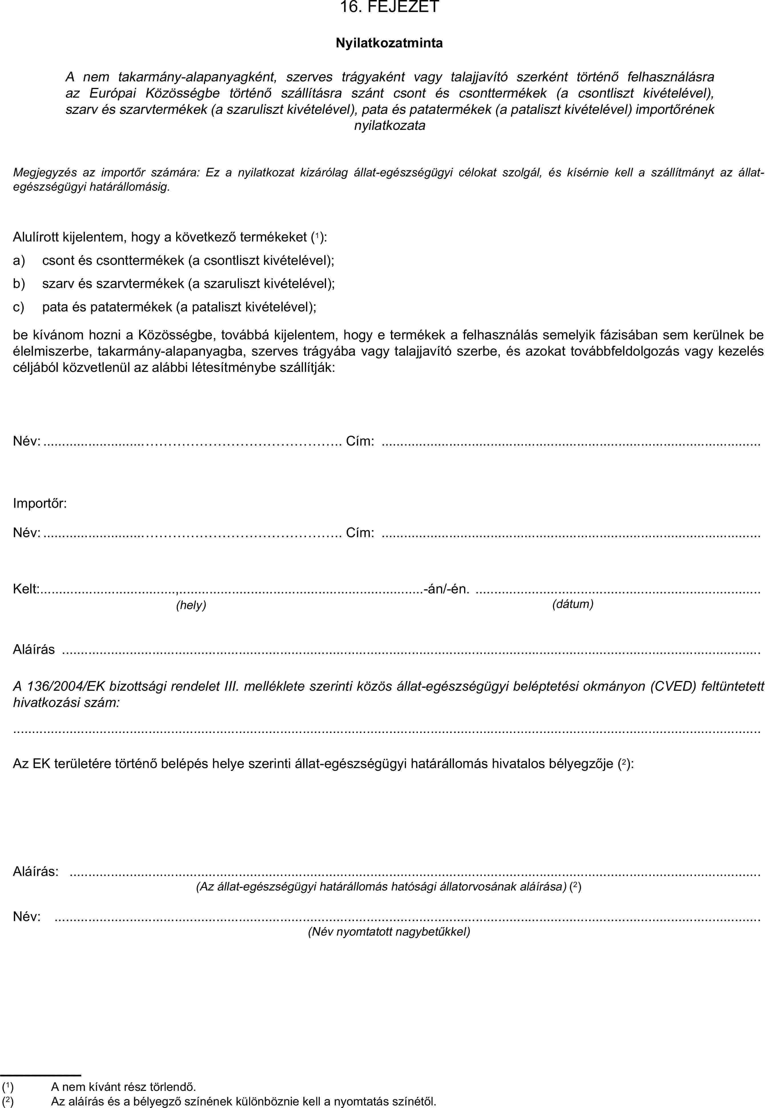Azon harmadik országok jegyzéke, amelyekből a tagállamok a nem takarmány-alapanyagként, szerves trágyaként vagy talajjavító szerként történő felhasználásra szánt csont és csonttermékek (a csontliszt kivételével), szarv és szarvtermékek (a szaruliszt kivételével), pata és patatermékek (a pataliszt kivételével) behozatalát engedélyezhetik (16. fejezet szerinti nyilatkozat)