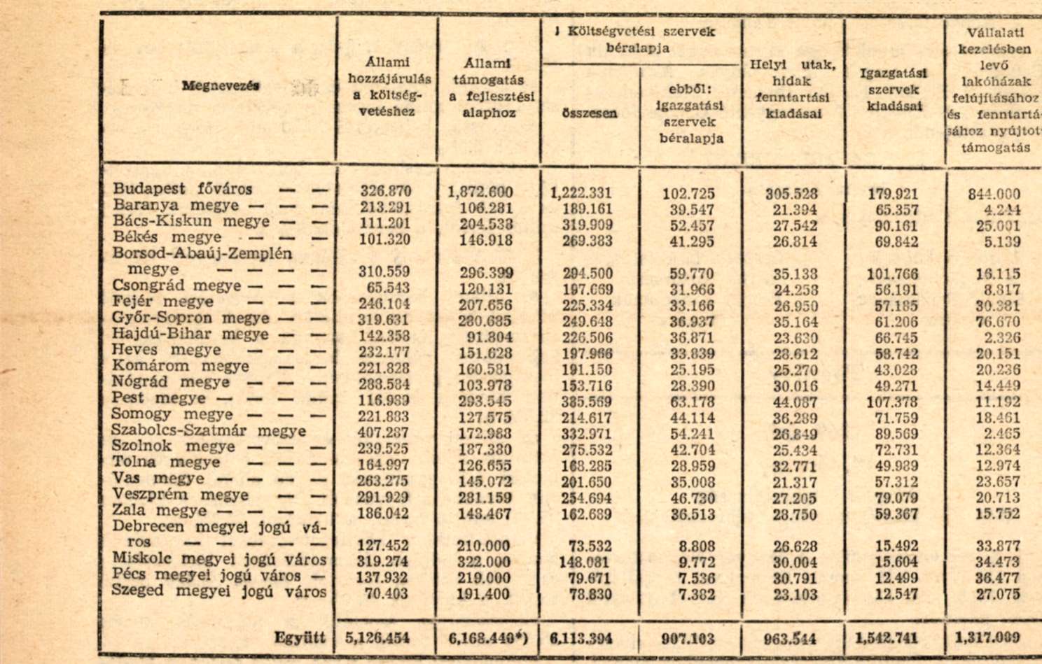 az állami beruházások költségvetést terhelő kiadása, a tanácsi fejlesztési alapok támogatására fordított kiadás, továbbá a beruházásokkal kapcsolatos vállalati forgóalapkiegészítés és a mezőgazdasági termelőszövetkezetek támogatásának kiadása 32.001 millió forint, a kiadások 22,8%-a;
