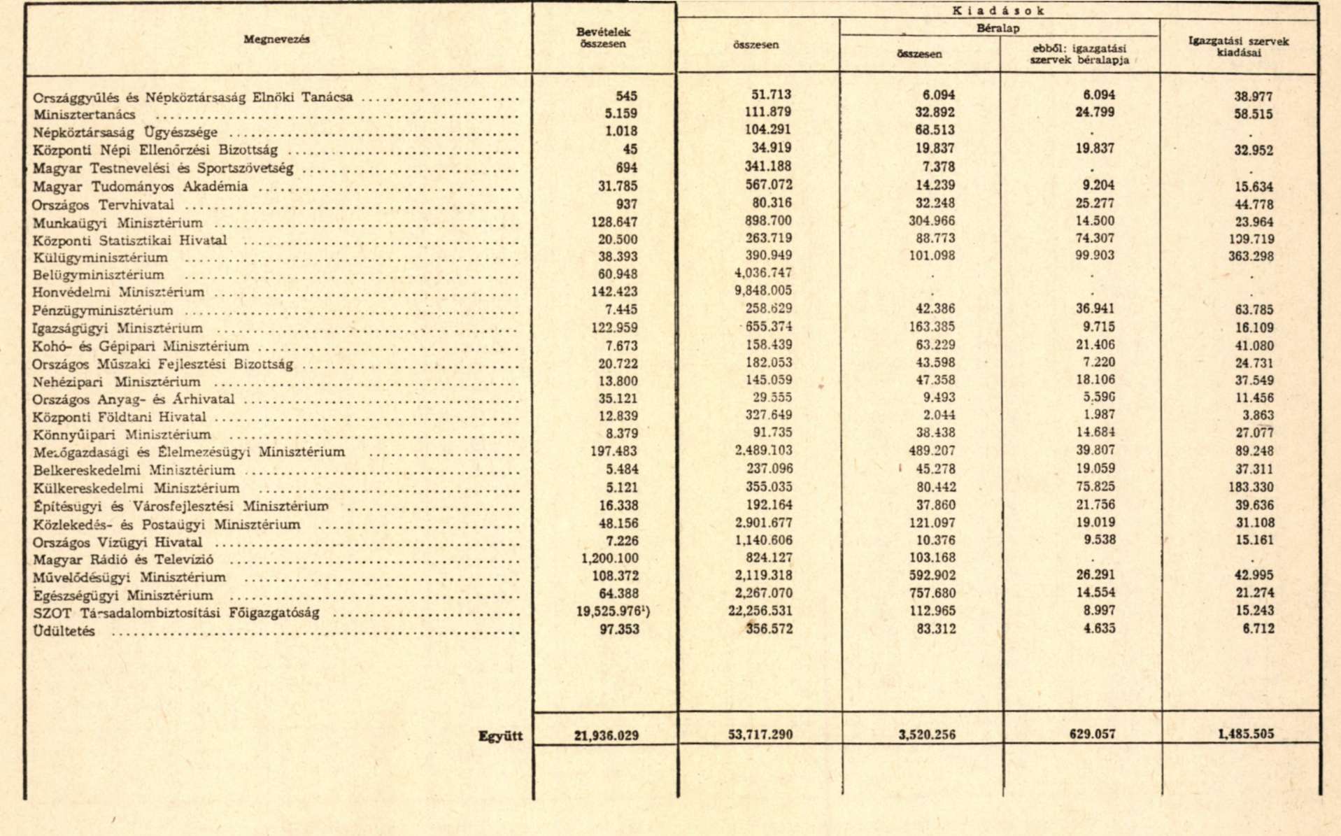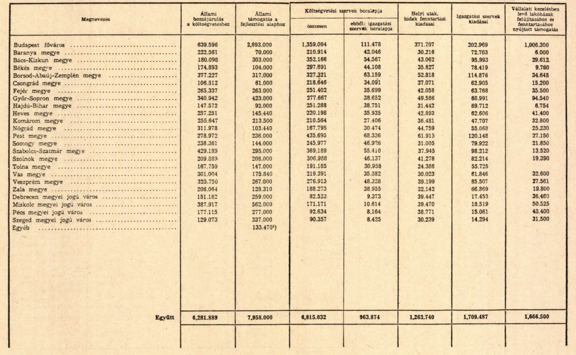 - a beruházásokkal kapcsolatban az állami költségvetést terhelő és a tanácsi fejlesztési alapok támogatására fordított kiadások, továbbá egyes állami beruházásokkal kapcsolatos vállalati forgóalap juttatások és a központi készletezéssel összefüggő, valamint a mezőgazdasági termelőszövetkezetek részére folyósított beruházási jellegű támogatási kiadás 37.384 millió forint, a kiadások 21,3%-a;