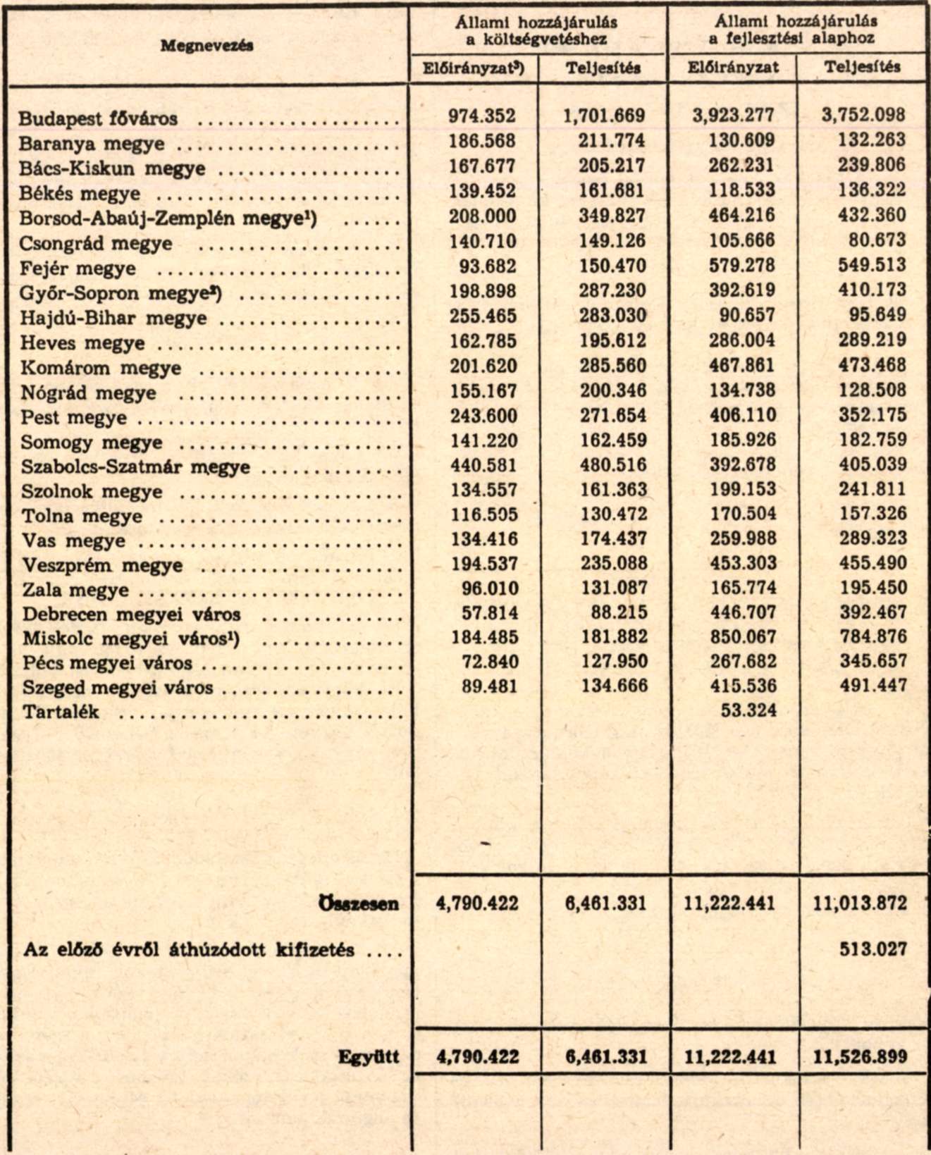 1) Az egészségügyi intézmények átadása miatt Borsod-Abaúj-Zemplén megye állami hozzájárulása 51.277 ezer forinttal növekedett, Miskolc megyei város állami hozzájárulása azonos összeggel csökkent 2) Tartalmazza Győr megyei város adatait is.