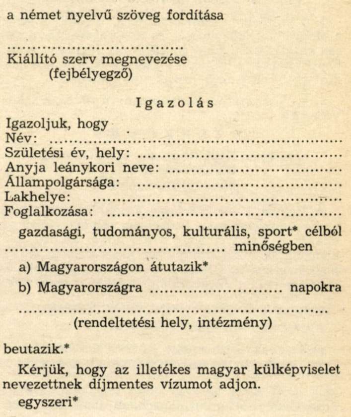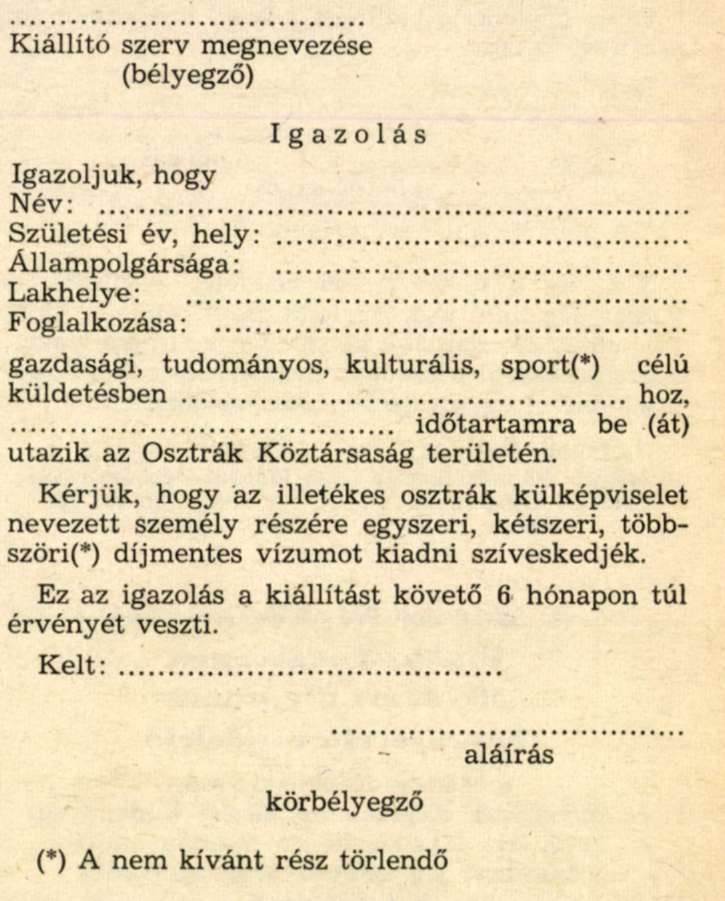 (1) Érvényes osztrák polgári útlevéllel rendelkező osztrák állampolgárok, akik gazdasági, tudományos vagy kulturális feladat ellátására a Magyar Népköztársaság területére be-, vagy azon keresztül utazni kívánnak az ilyen utazásokhoz szükséges vízumot díjmentesen, hat havi érvényességgel kapják, ha a magyar külképviseleti hatóságoknak, magyar szerv hivatalos meghívását, vagy gazdasági feladatok ellátását szolgáló utazás esetén törvényes szakmai érdekképviselet, a tudományos vagy kulturális célokat szolgáló utazás esetén az illetékes szövetségi minisztérium, illetve Tartományi Kormányhivatal igazolását az utazás szükségességéről bemutatják.