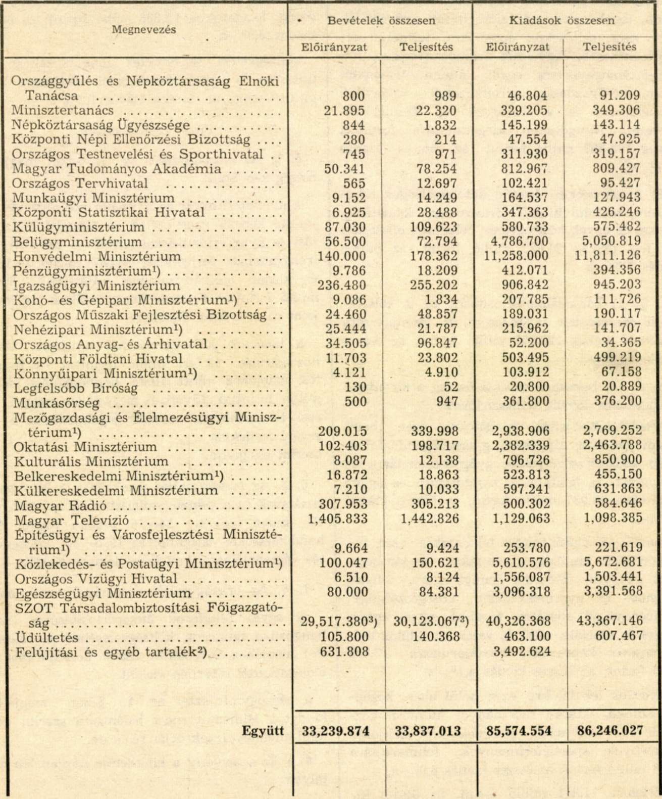 3. § (1) Beruházásra, tanácsi fejlesztési alapok pénzeszközeinek növelésére, magánlakásépítéshez nyújtott állami támogatásra, egyes állami beruházásokkal kapcsolatos forgóalap-juttatásra, vállalati fejlesztési alapok kiegészítésére, központi készletezésre és mezőgazdasági szövetkezeti beruházások támogatására elszámolt összeg 65.022 millió forint, az összes kiadás 20,6%-a.