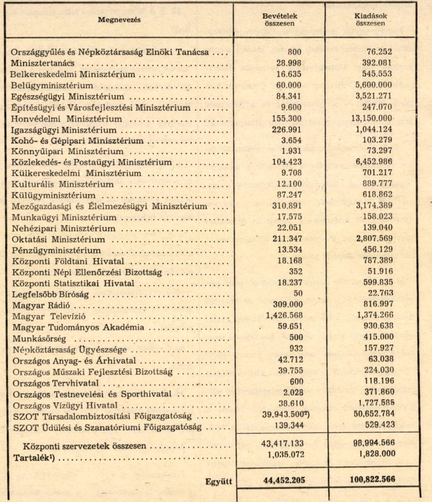 5. § Az országgyűlés az 1. §-ban megjelölt összegeken belül a minisztériumok és az önálló költségvetési fejezetet képező szervezetek kiadási előirányzatát 100 823 millió forinttal, társadalombiztosítási és nyugdíjjárulékkal növelt bevételi előirányzatát pedig 44 452 millió forinttal az 1. számú melléklet szerint állapítja meg.