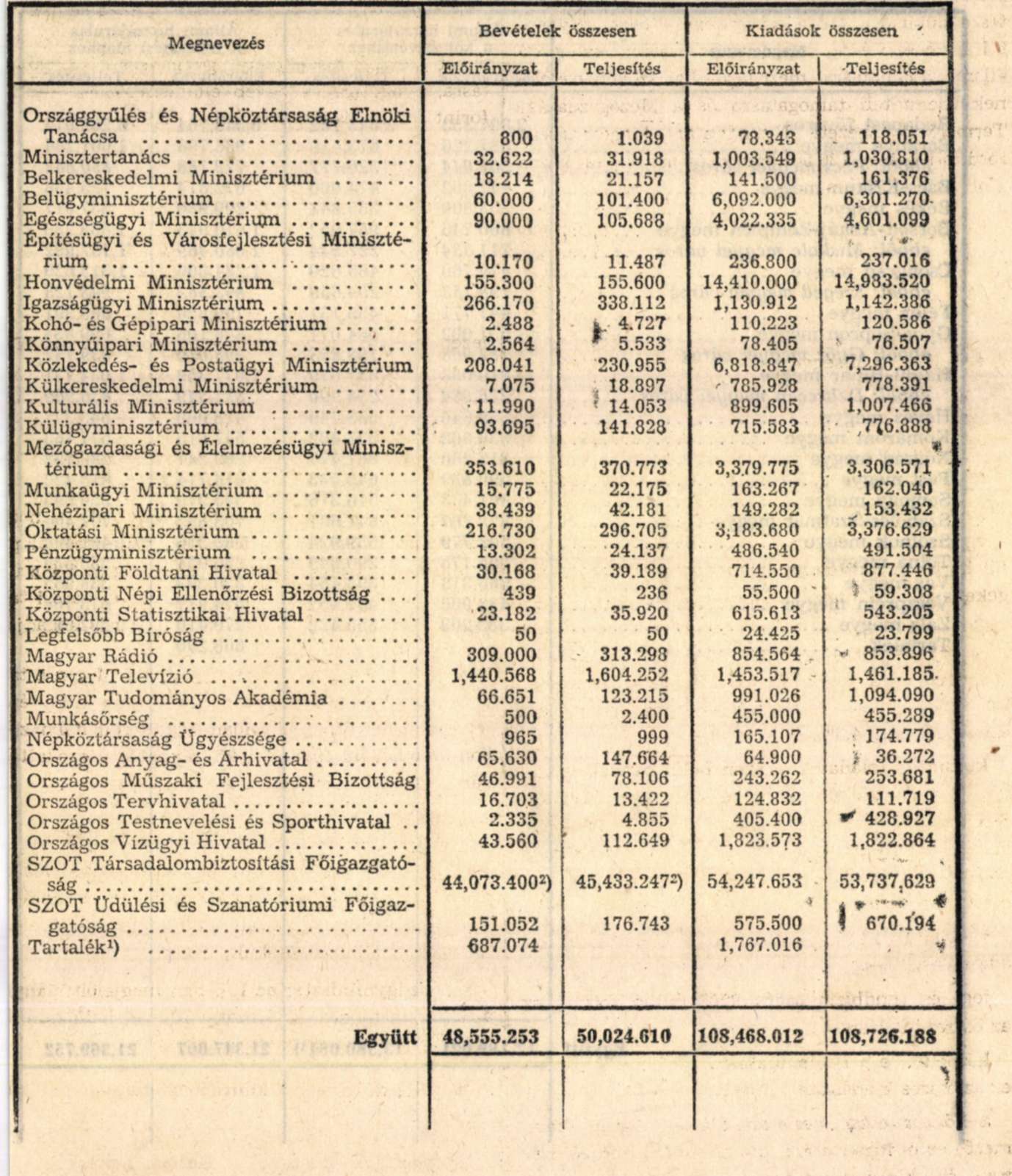 a minisztériumok és az önálló költségvetési fejezetet alkotó szervezetek - társadalombiztosítás és nyugdíjjárulékkal növelt - bevételi előirányzatainak teljesítését 50 025 millió forinttal, kiadás előirányzatainak teljesítését pedig 108 726 millió forinttal fejezetenként az 1. melléklet szerint,