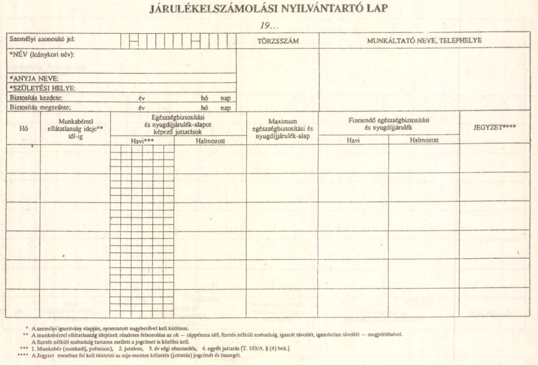 - a lakás magánerőből történő építése céljából, valamint ápolásra, gondozásra szoruló közeli hozzátartozó ápolása címén engedélyezett fizetés nélküli szabadság időtartamát, "fiz. nélk. szab.", "lak. ép.", "kh. áp." jelzéssel. A nyilvántartó lap "Jegyzet" rovatában "ny. jár. fiz. -tól -ig" megjegyzéssel fel kell vezetni azt az időtartamot, amelyre a R-nek az 1992. február 29-ig hatályos 301., illetőleg a 305. § (5) bek. alapján nyugdíjjárulékot fizettek.