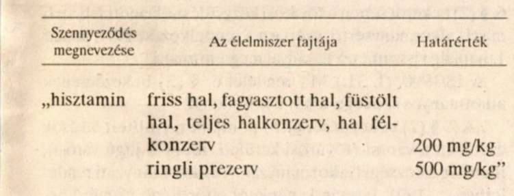 Az R. 4. számú mellékletében foglalt táblázat a hisztaminra előírt határértékek vonatkozásában az alábbiak szerint módosul: